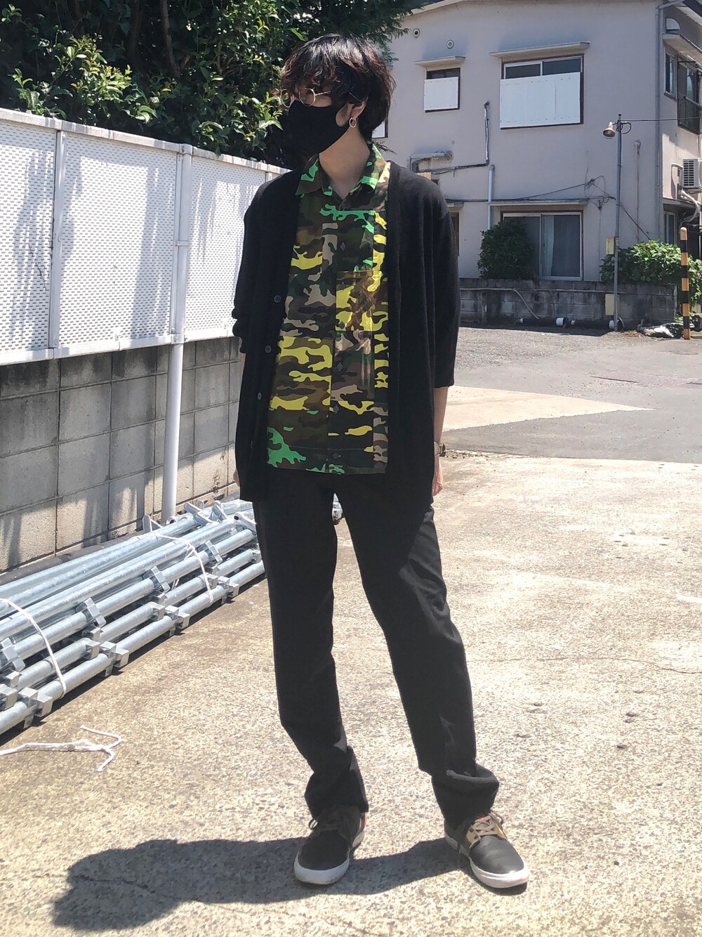 お気に入りの迷彩シャツにカーディガン。 もう夏です。完全に。