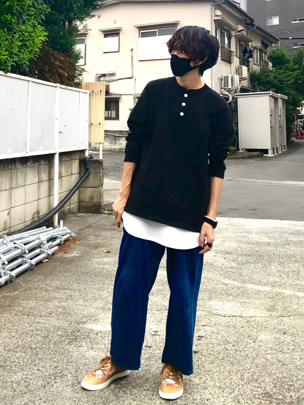 ボタンがかわいい黒のカットソーにワイドのデニムを合わせました。シンプル!