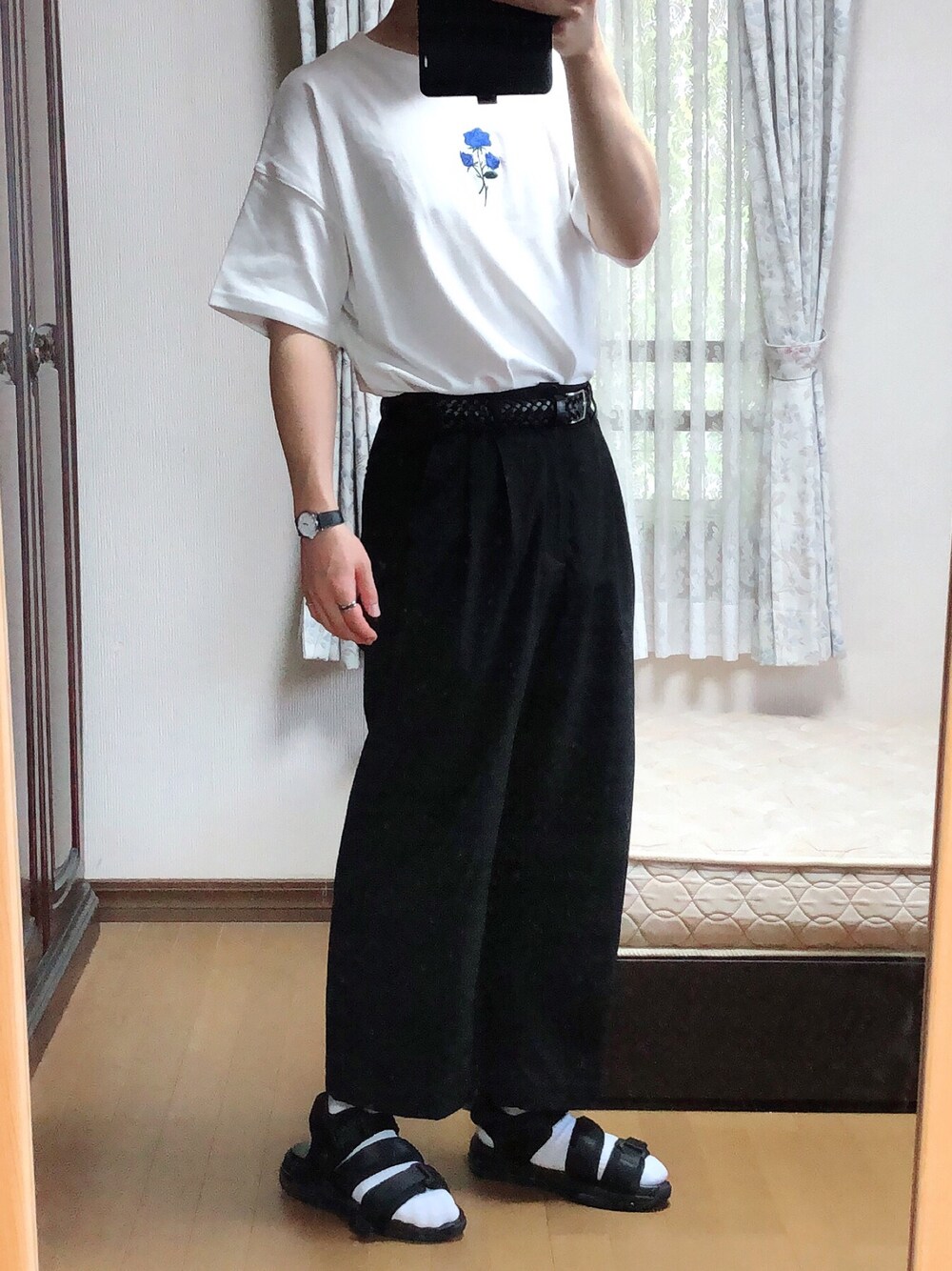 タックインコーデ😎✨ 白のTシャツと白ソックスで統一感💪🏻 <size> トップス:S 指輪:FREE ベルト:M パンツ:M ソックス:27.0 サンダル:L