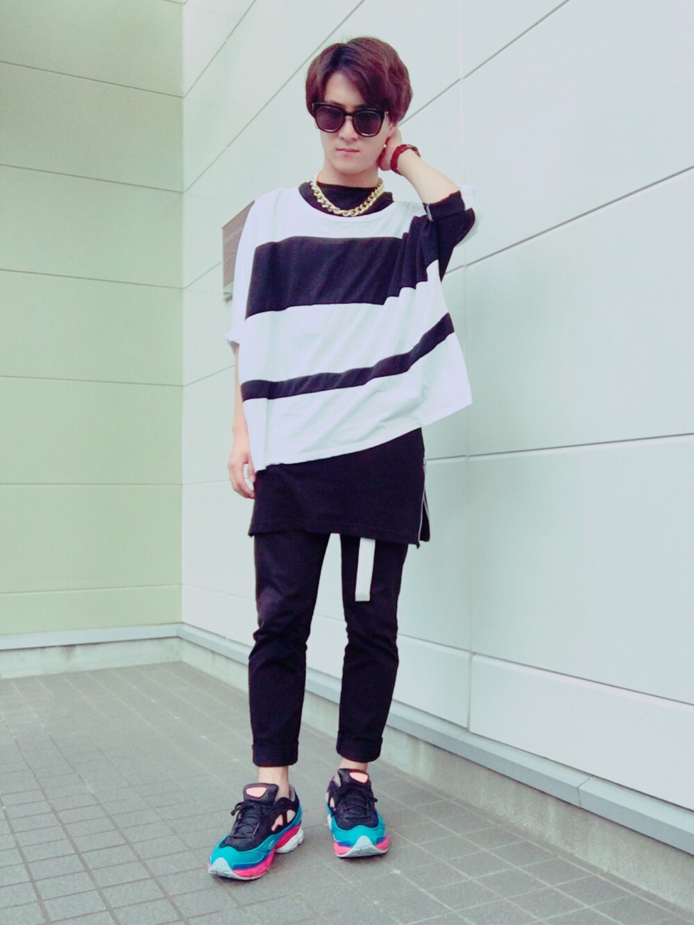 ドルマンのきいたビッグTシャツをレイヤードとして今風に。 ネックレスとスニーカーをアクセントに。