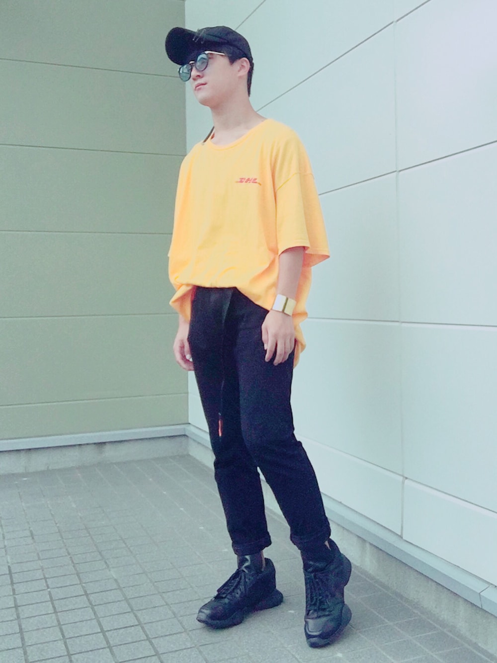 お久しぶりです。 DHLのモデルはVETEMENTSの流れで流行りましたね。DHLブランドのTシャツもさりげない存在感がいい感じですよ。 ちなみに着用しているのはXXLです。