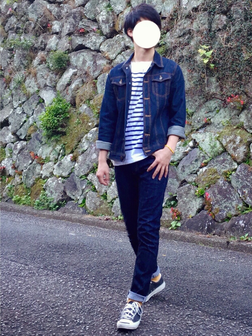 見てくれてありがとうございます❗️ Gジャンとデニムパンツで デニムセットアップ❗️ インナーは王道ボーダー。 ロールアップして靴下見せ。 靴下の色は低評価でした。笑 靴はめっちゃ気に入った JP《Jack Purcell》 レザーにひび割れ加工が いい味出してます。 最近多忙で疲れたので 一休さんしときます❗️笑 じゃぁまた見て下さ〜い❗️