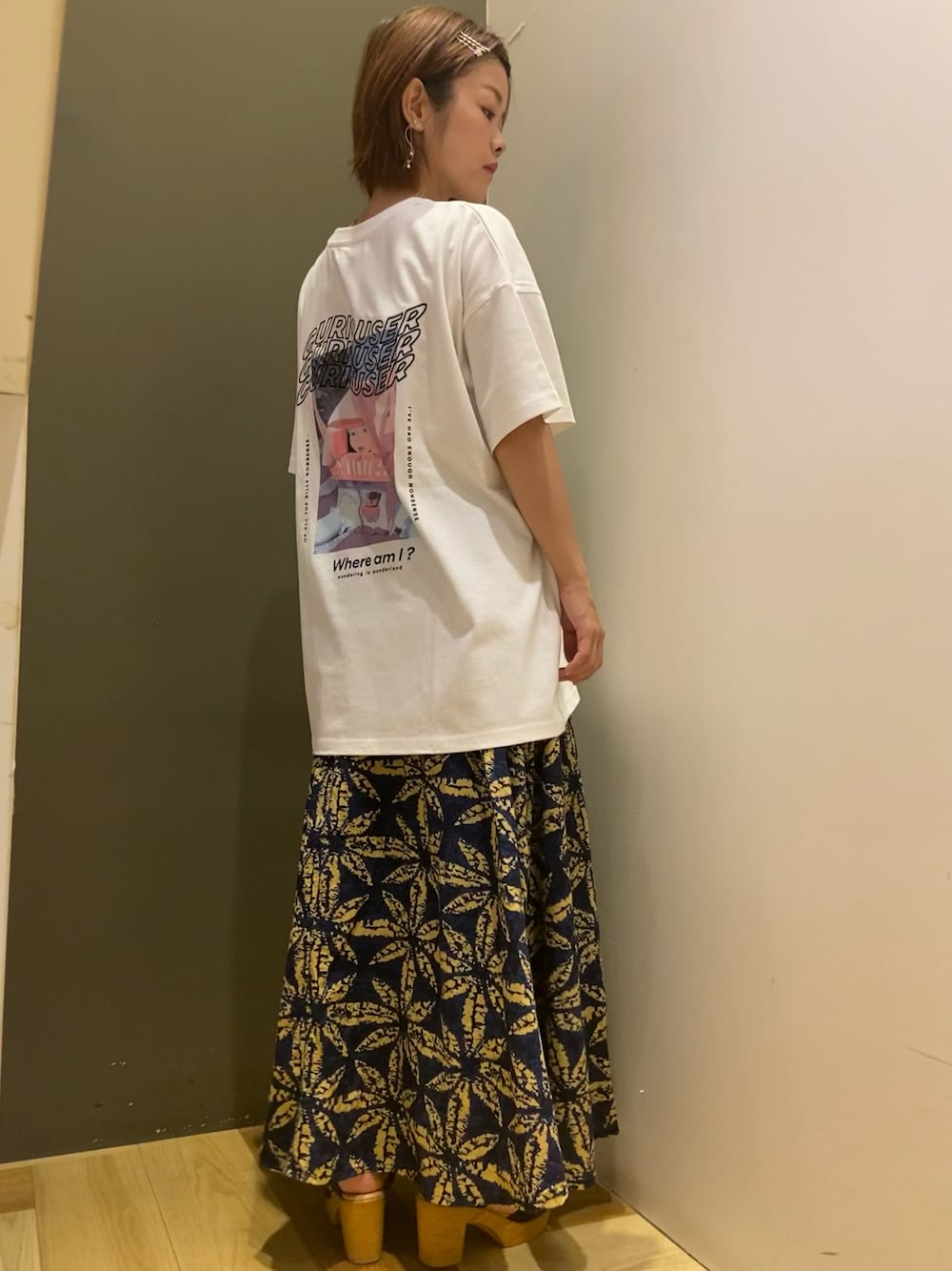 moun3のスカート「Iインドプリントギャザースカート*」を使ったコーディネート
