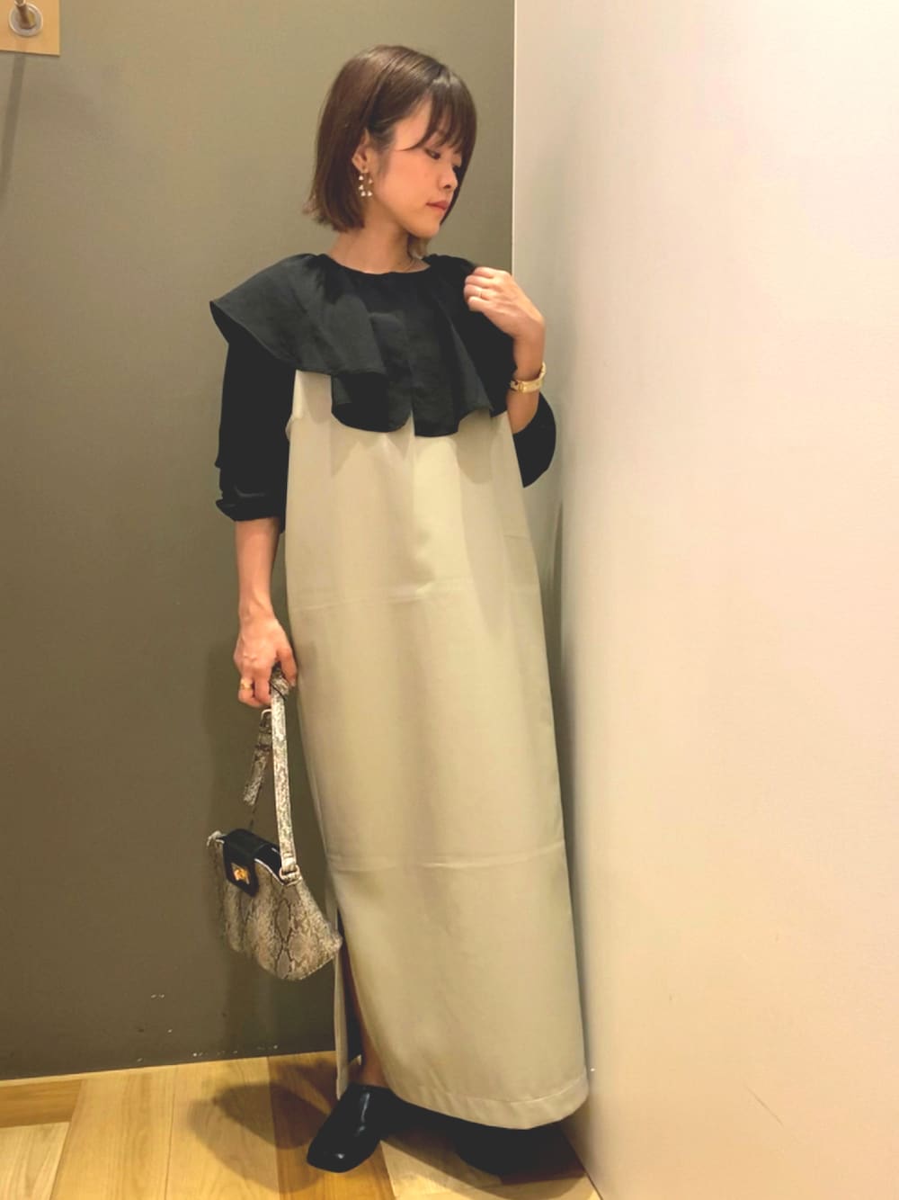 レザー調のキャミワンピースです。 キャミワンピース可愛らしい雰囲気な物が多いですが、こちらはモードな雰囲気になりますよ。 肩紐が調整出来るので身長に関係なく着ていただけます。 着回しのきくフリル襟のブラウスと合わせて女性らしく。 こちらのブラウスもシワになりにくい素材でお手入れが簡単です。