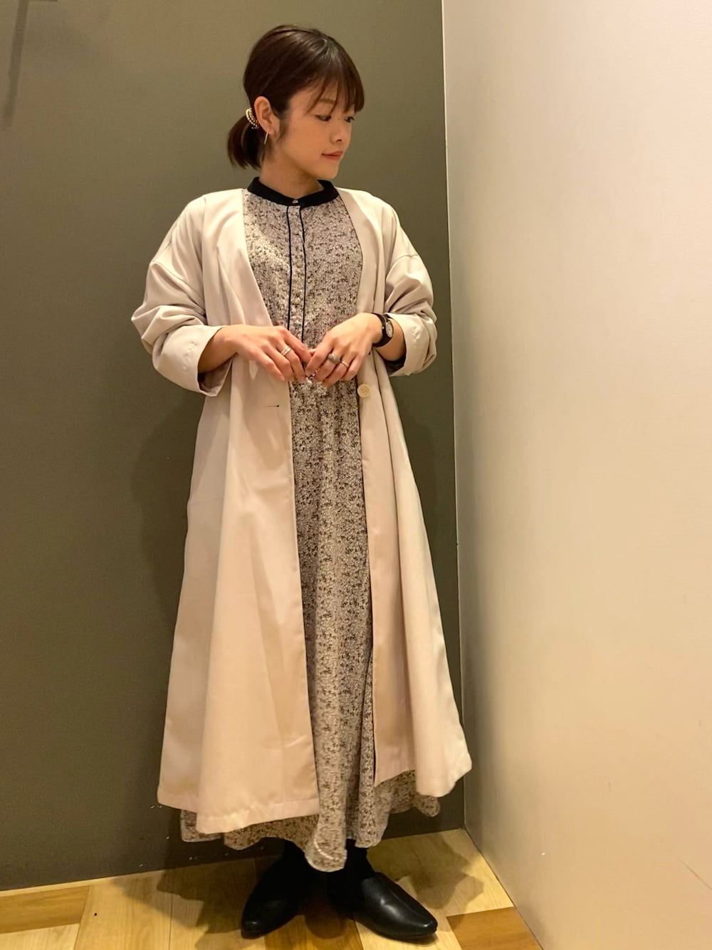 普段のサイズ 服 S 靴 23cm、M 着用のサイズ 服 F 靴 M ◯アウター ノーカラーのサラッと羽織れるアウターです。 カジュアルにもキレイめにも合うので、春にヘビロテ出来そうです。 これからの時期は卒業式や入学式等のスーツのアウターにもオススメです。 ◯ワンピース 小花柄のワンピースですが落ち着いた色合いなので大人っぽく着られます。ウエストと袖口がゴムで着心地がいいです。 ◯靴 ミュールなのでサッと履けてこなれ感があります。 パンツにも相性がいいです。 普段23cmでMサイズがちょうどよかったです。