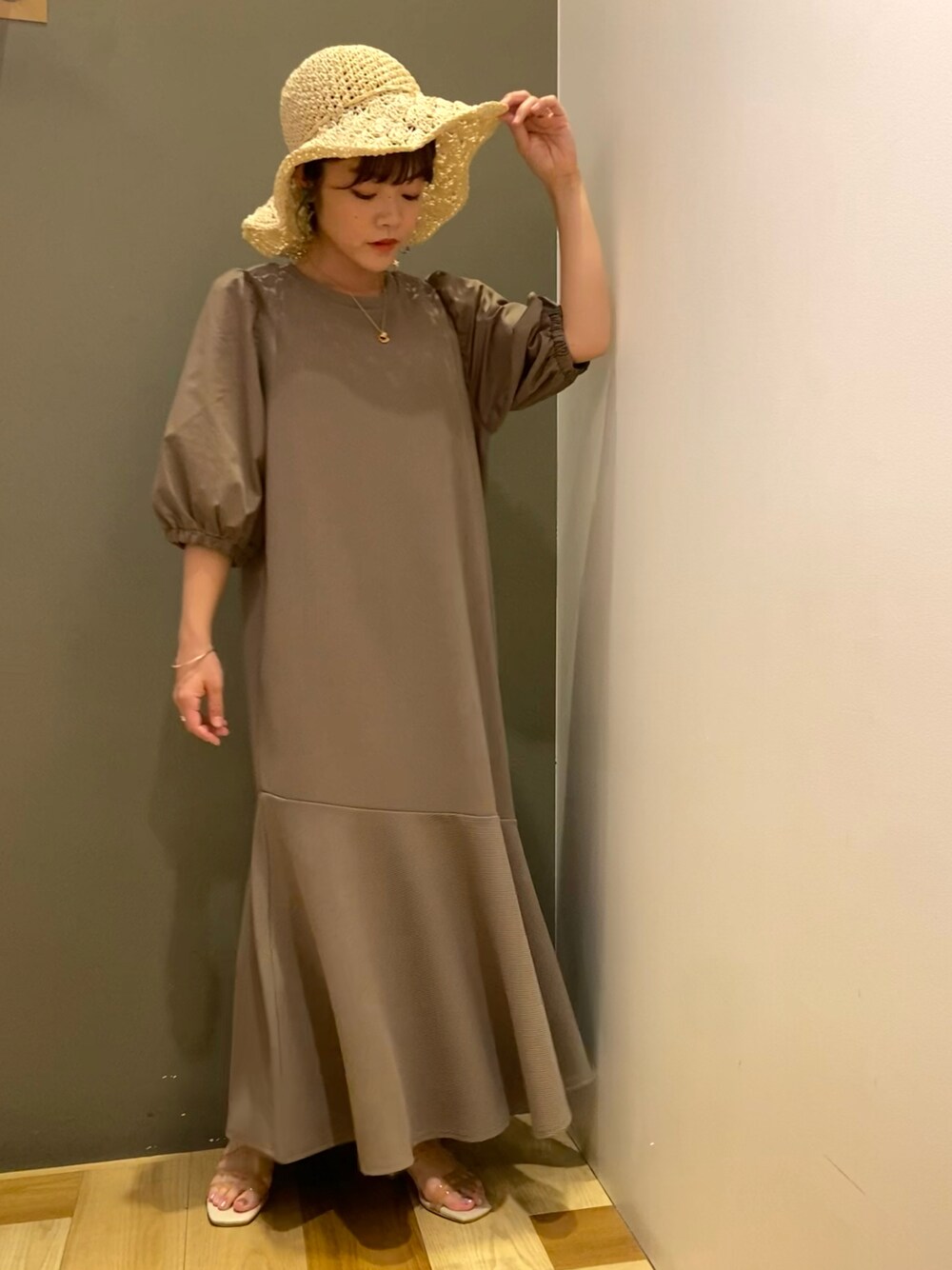 普段のサイズ 服S 靴23、M 着用のサイズ 服F 靴M ◯ワンピース マーメイドシルエットのきれいなワンピース♪ 袖の部分がシャツの様な生地になっていて、 ふっくらとした袖が二の腕カバーしてくれます。 とても着心地が良く、夏にサラリと一枚で着られて上品な雰囲気のワンピースは夏のディナーデートにもオススメですよ(o^^o)