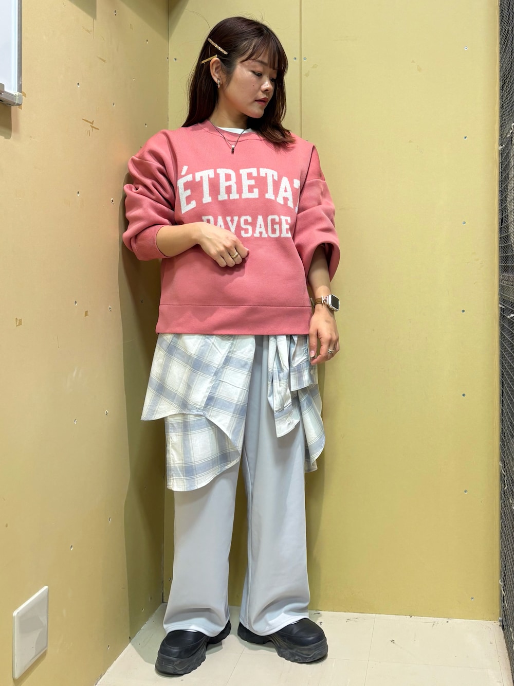 トップス サラッとした着心地の春ニット♪ ロゴの部分はさりげないラメ感で可愛いです♪ 今年はピンクもトレンドカラーなので普段あまりピンクを選ばないのですが挑戦してみました^_^ カジュアルにパンツスタイルで合わせれば甘くなり過ぎず着られますよ♪ シャツ 強過ぎないチェック柄なので合わせやすくコーディネートのポイントになります。 薄手のサラッとした生地で夏まで使えます。 ボトムス シンプルなので何にでも合わせやすくてオススメ♪ ウエストには紐も入っているので細身の方でもウエスト調整して履けますよ♪ ウエストはゴムなので履き心地も良く、小柄な方は一回折って履いてもシルエットが崩れないので大丈夫です◎