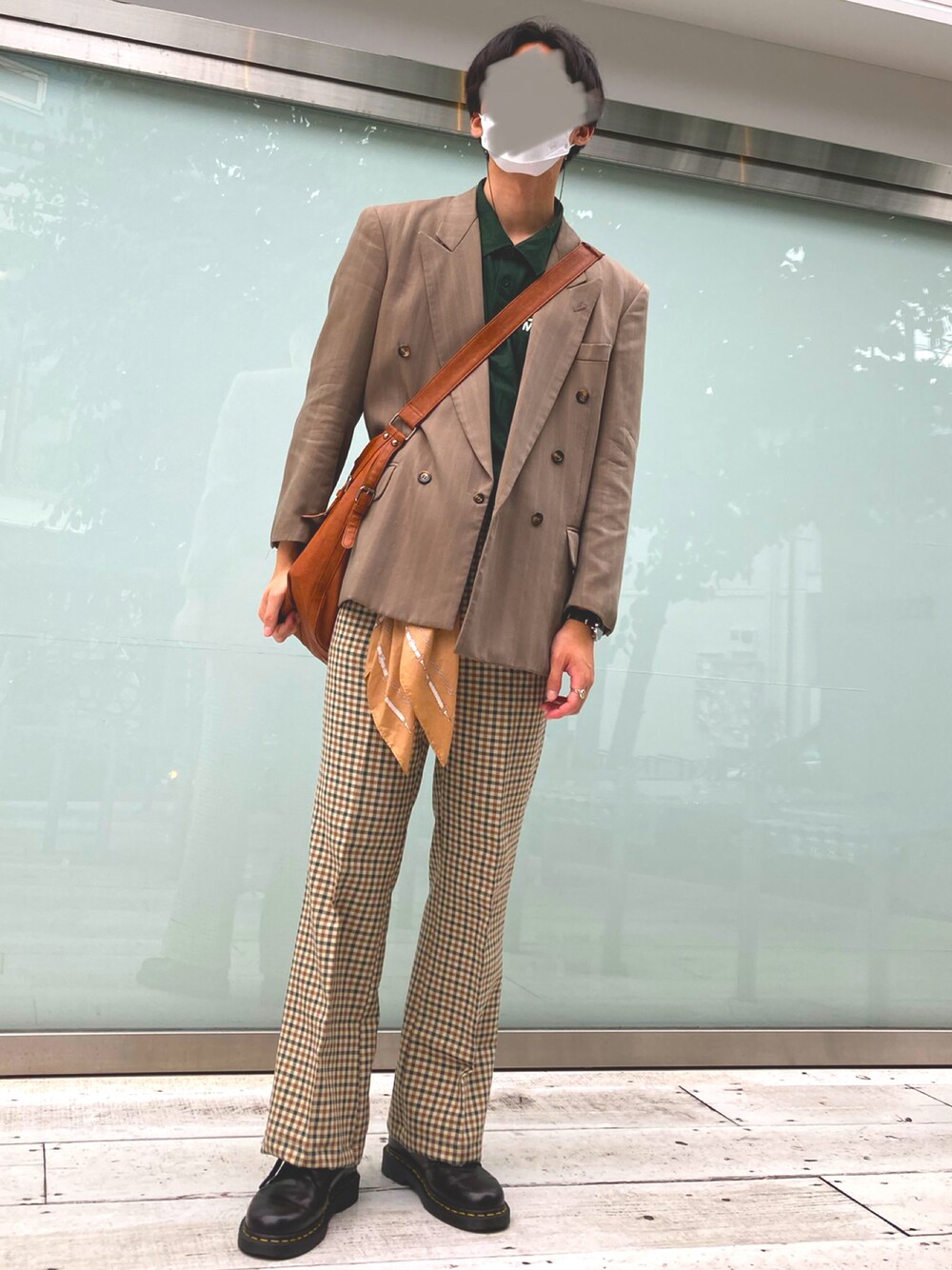 東京お散歩コーデ。古着ほぼ全振り。 先週高円寺で調達した、圧倒的優勝のチェックフレアパンツと革靴マーチンにジャケットを合わせて70'sコーデを意識してみました。見えにくいですが、中には緑を拾って緑ポロです。 ショルダーバッグはこれが古着テイストにめちゃくちゃ合う!これからも大切に使いたい。