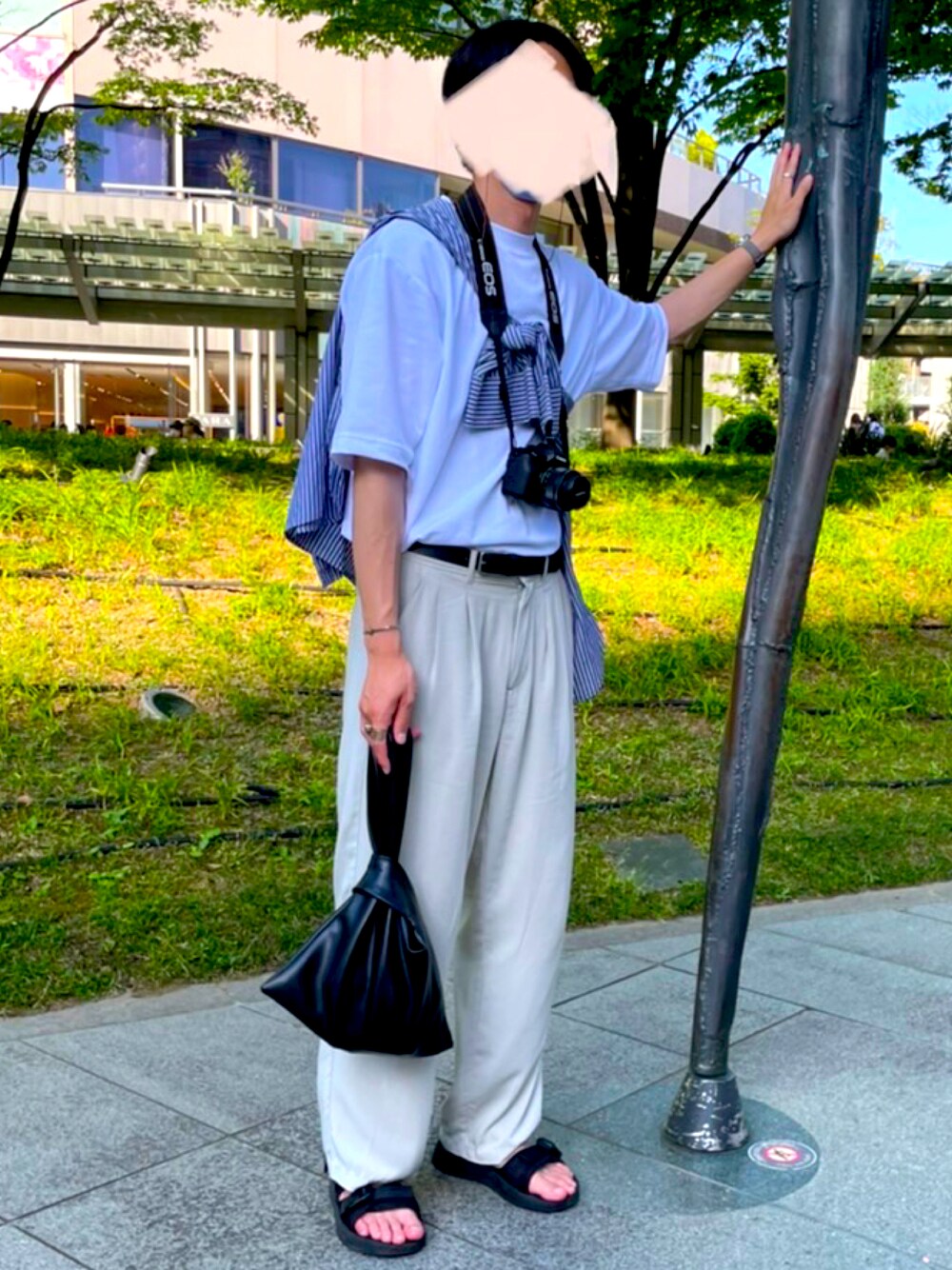 今日も東京観光。 UNIQLOの白Tシャツ今年買ったやつを早速着てみた!あとたすき掛け上手くハマったかな、、、 夏にしか履けないこのレーヨンストレートパンツ。やっぱ履き心地最高すぎる!