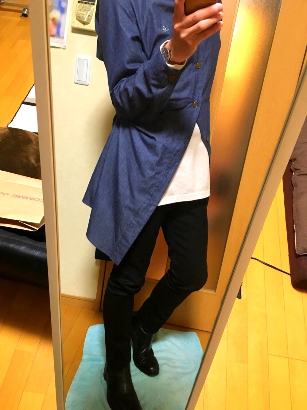 はい。 ♂アラサー新春コーデ… というか。基本的に本日よりこーでぃねいと()は考慮せず参ります。ただただ着たい。ただそれだけ。 暖かくなるまで寝かしておいた、言わば熟成服たちを遂に解き放つ時来る。 春の陽気に当てられてアラサーが乱心の装い…ヴィヴィアンの店員さんにも「良い感じにアタマおかしくなってきましたね」と言われたのは、このシャツのディテールを御覧頂ければ理解も出来ようと言うもの。 長い!デロデロ!妙な縫製!総てが不条理な、実にヴィヴィアンらしい逸品。 しかしそんなキ◯◯イ的デザインとは裏腹に意外と使い勝手が良い気がしてきたぞコヤツ…見えにくいですが後身頃にはトレンチの様なストームシールド状のディテールが。 そうか、シャツとして捉えるから異質に見えるだけでライトアウターと考えれば…!…変なもんは変だ。 ロングにはロングを当ててしまえとばかりにアタシのお花畑脳が自然にチョイスしたのはカズユキクマガイのロングカットソー。オフホワイトの、ともすればいなたい風合いがシャンブレーには良く合う気がしたんです。 対照的に下半身はあくまでコンサバティブに。というか。メンズの場合ってトップスで遊ばないと、というか。下半身でやらかしちゃうと妙に悪目立ち過ぎるきらいがあるというか。 なんかこう…作為過剰に感じてしまうのはアタシだけなのかしら。 ま、そういうテクニカルな着こなしが出来るのは若者達の特権という事で。アラサーはこの位のお遊びを。春ですもの。なんてったって春。