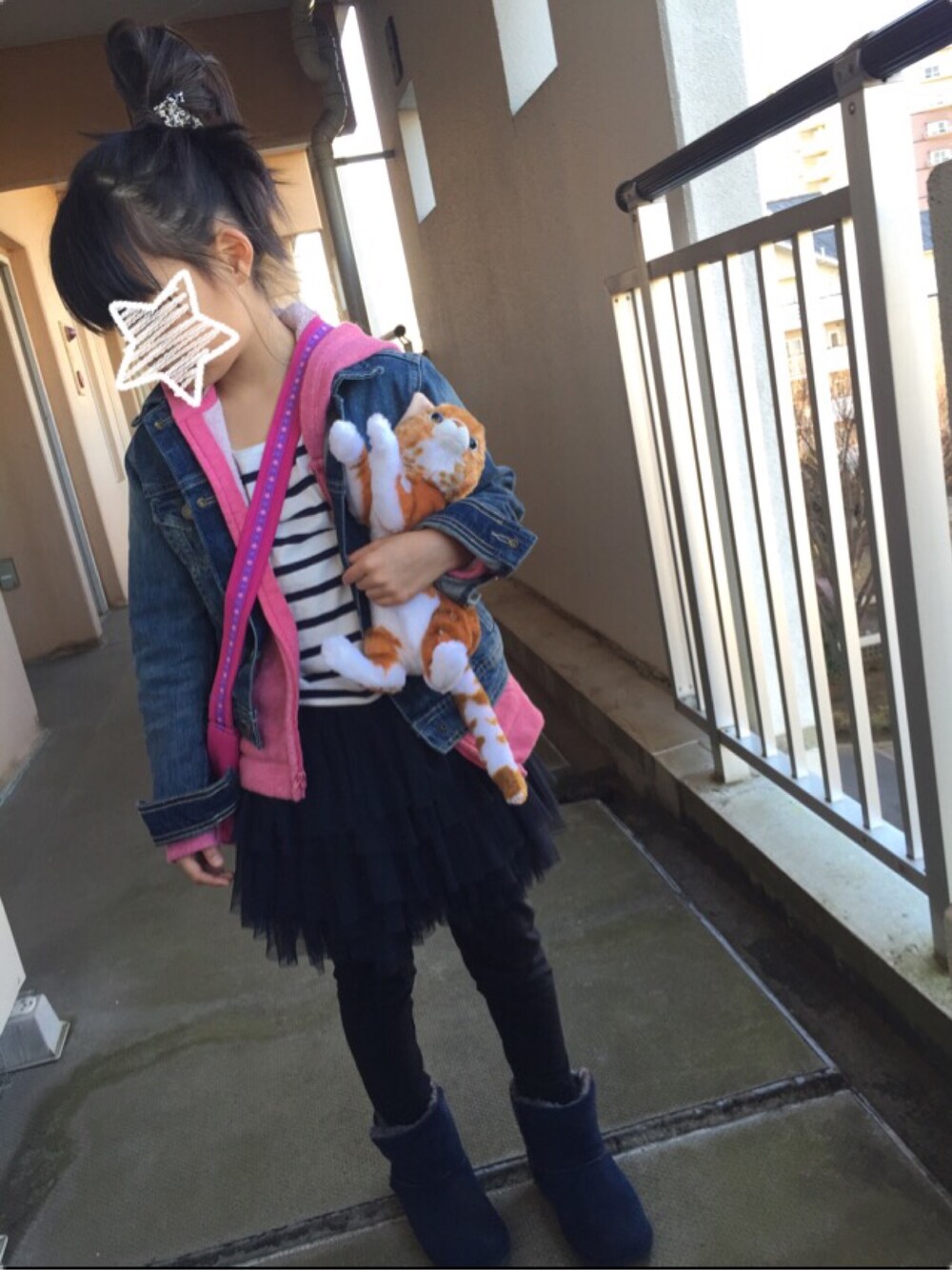 GAPのデニムジャケット、50%オフのさらに10%オフでゲットできてラッキー! サンタさんからもらったネコちゃんも連れてお出かけ😻