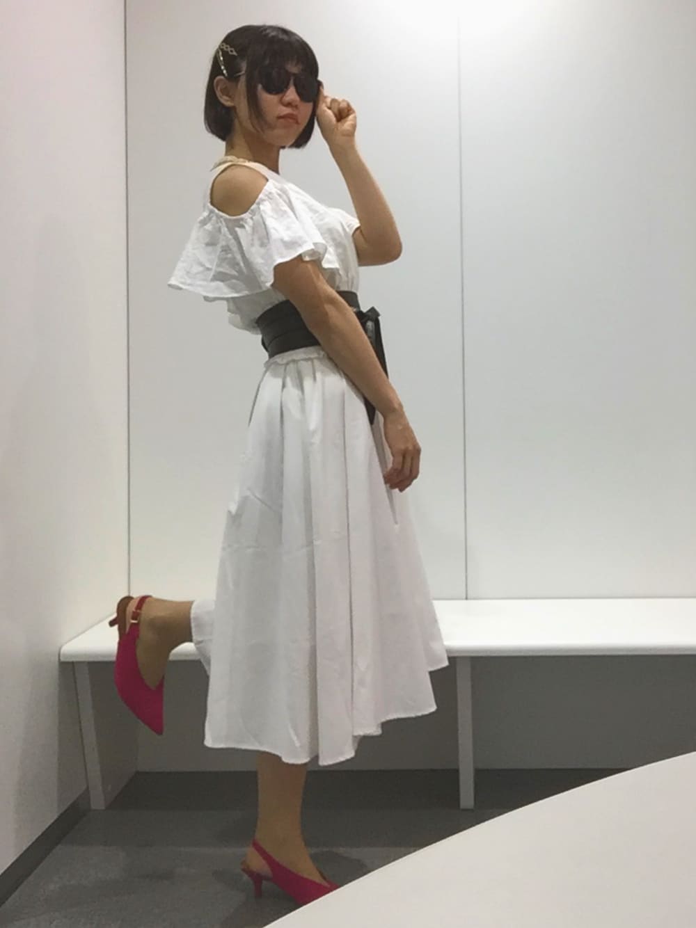 ホワイト系のスカート、ピンク系のシューズ、ブラウン系のサングラスを着用したレディースの春コーディネートの1枚目の写真