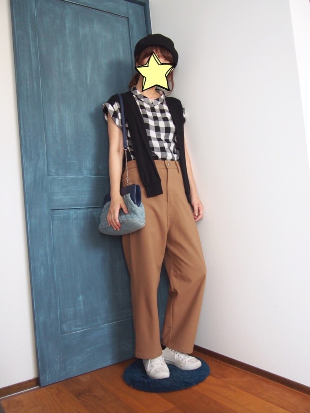 白×黒のブロックチェックのシャツは、カーデ羽織ってる風な袖がドッキング。 フリルとか、チュールとか、リボンとか、何かプラスα付いてるってのに弱いワタシ😅