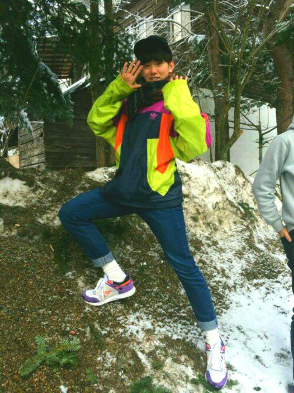 温泉ってきました 雪が降ってて寒い寒い りゅうちぇるみたいで お気に入りのウィンブレです