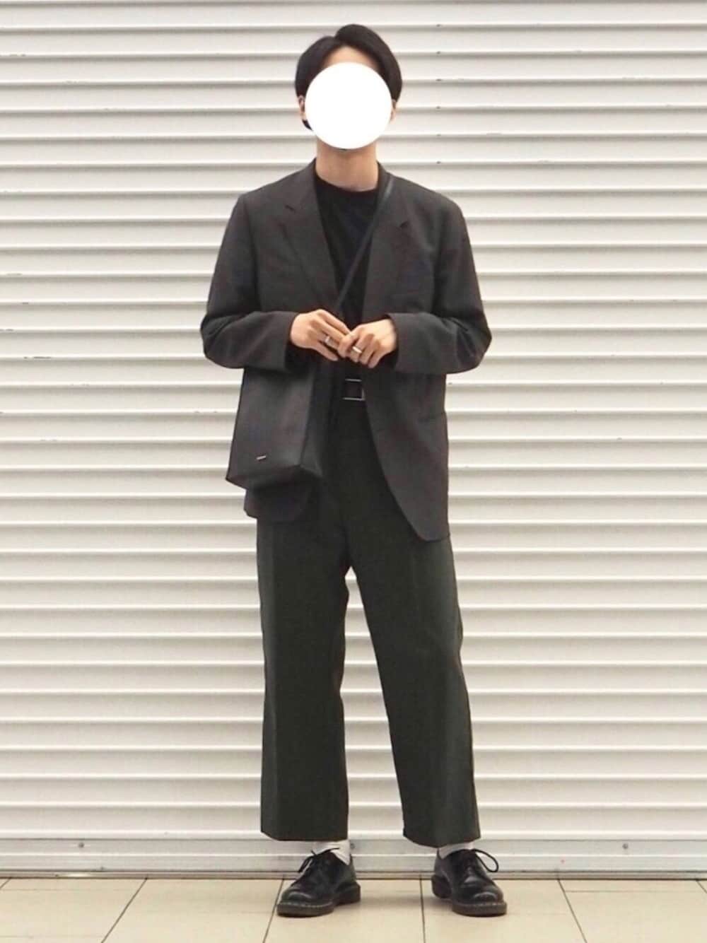 見ていただきありがとうございます! てもやです! グレージャケットにグリーパンツを合わせたモード系コーデです! 靴下をブラックにすると、より重ためのモードコーデにできるのですが、あえて靴下をホワイトにすることで、コーデ全体に少しの抜け感と軽さを出しました! また、ホワイトを使ってないので、差し色にホワイトを入れて、靴下をより映えさせました笑