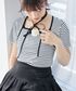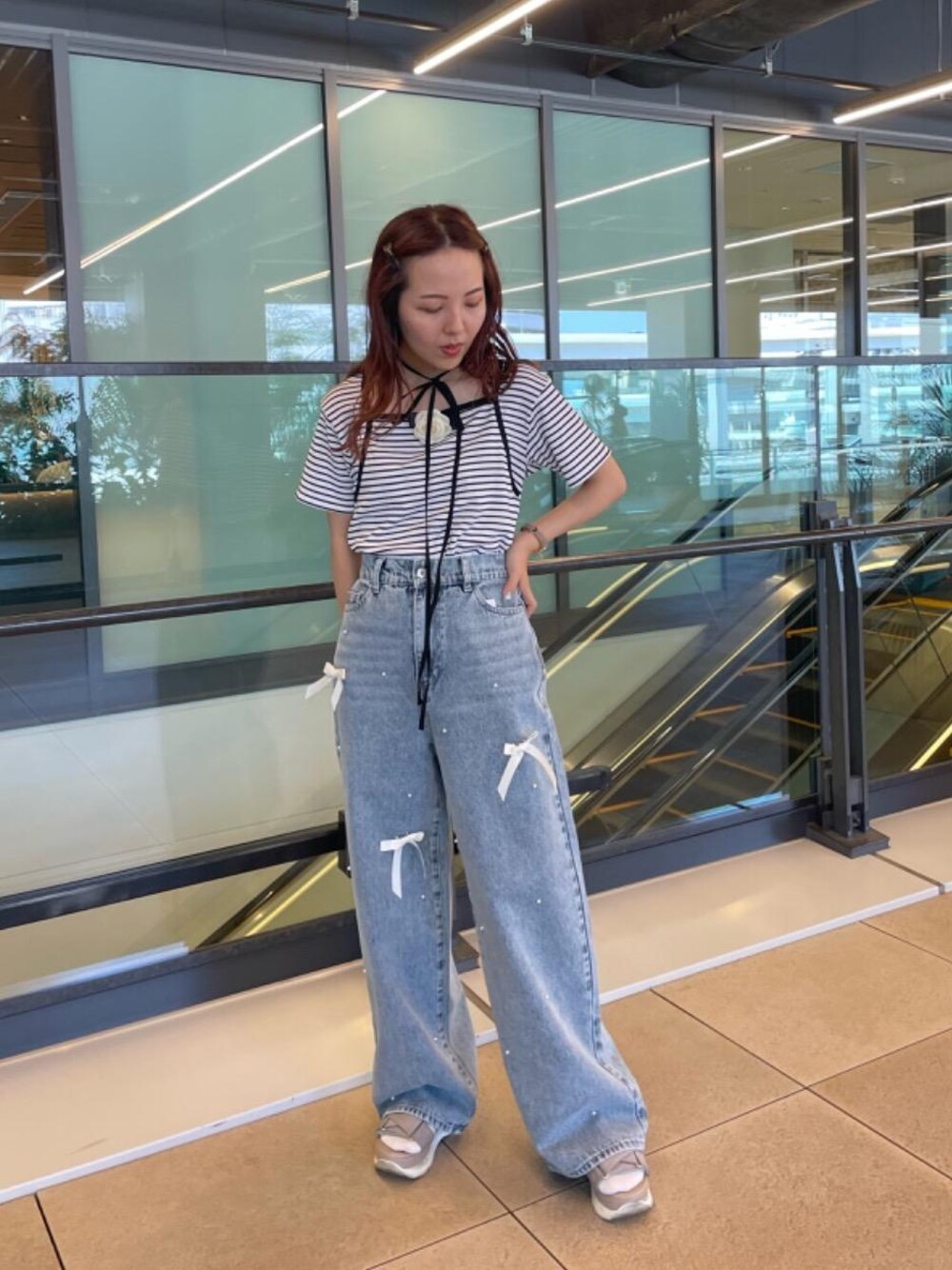 カジュアル派さんも取り入れやすいバラコーデ🌹 大きめのリボンとローズのブローチがトレンドばっちりなコーデ🎀 ボーダーとデニムなら甘々じゃなく取り入れられます✨️ トップスはサラッとしたTシャツ生地なので暑いうちから着て頂けます◎ デニムの白いリボンはブローチになってて取り外しできます🙆♀️ 150cmでも裾上げなしで履けて嬉しい🥺💕