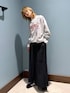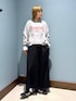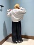 毎年人気のスカーチョパンツ 今年らしいデザインスウェットと合わせてトレンド感あるコーデに仕上げました♡ 肩周り少しチラ見えするので気になる方は私がしてるみたいにシャツをレイヤードしてもかわいいし、プリントに使われてる色のインナーを重ねても可愛いよ♪