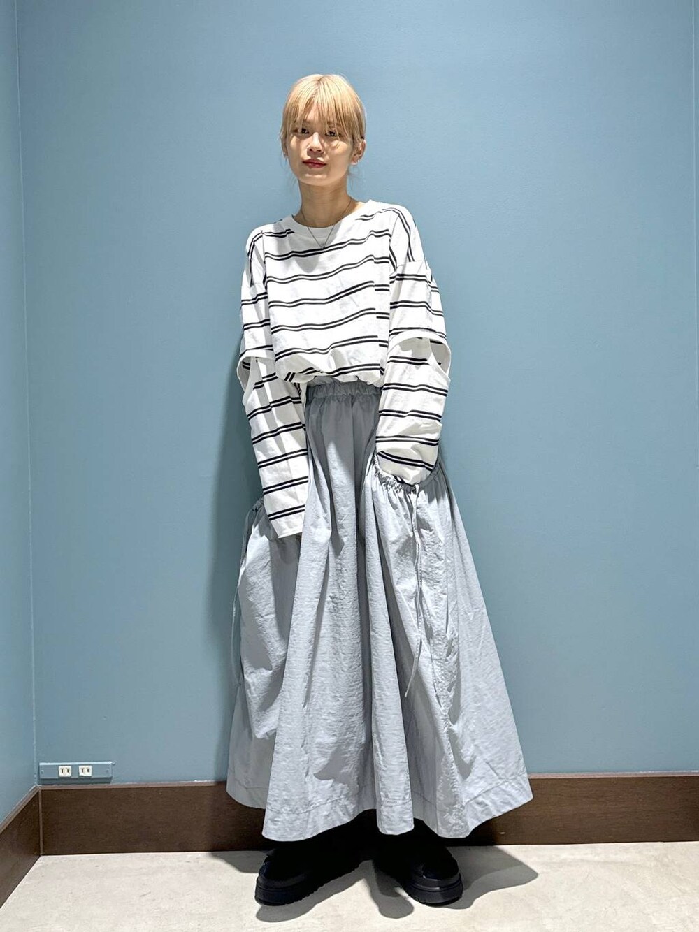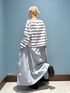 デザインカットの入ったロンTは1枚で様になるなあ✌🏻 ギャザーやポケット、シルエットの可愛いスカートと合わせればこれでデートコーデ完成〜!!✨