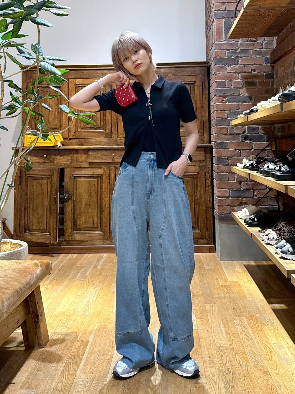トップスはタイトに パンツでボリュームを出すとスッキリとした見え方に🙆♀️ 赤いお財布はワタシモリアルバイ♡ 早速使ってるけどコンパクトでお金あんま持たない、カードも少ない方はおすすめ^^ サブ財布してもいいかも^^ みさよのデニムはセルフカットできるから 身長に合わせてカットしてみてね〜!!