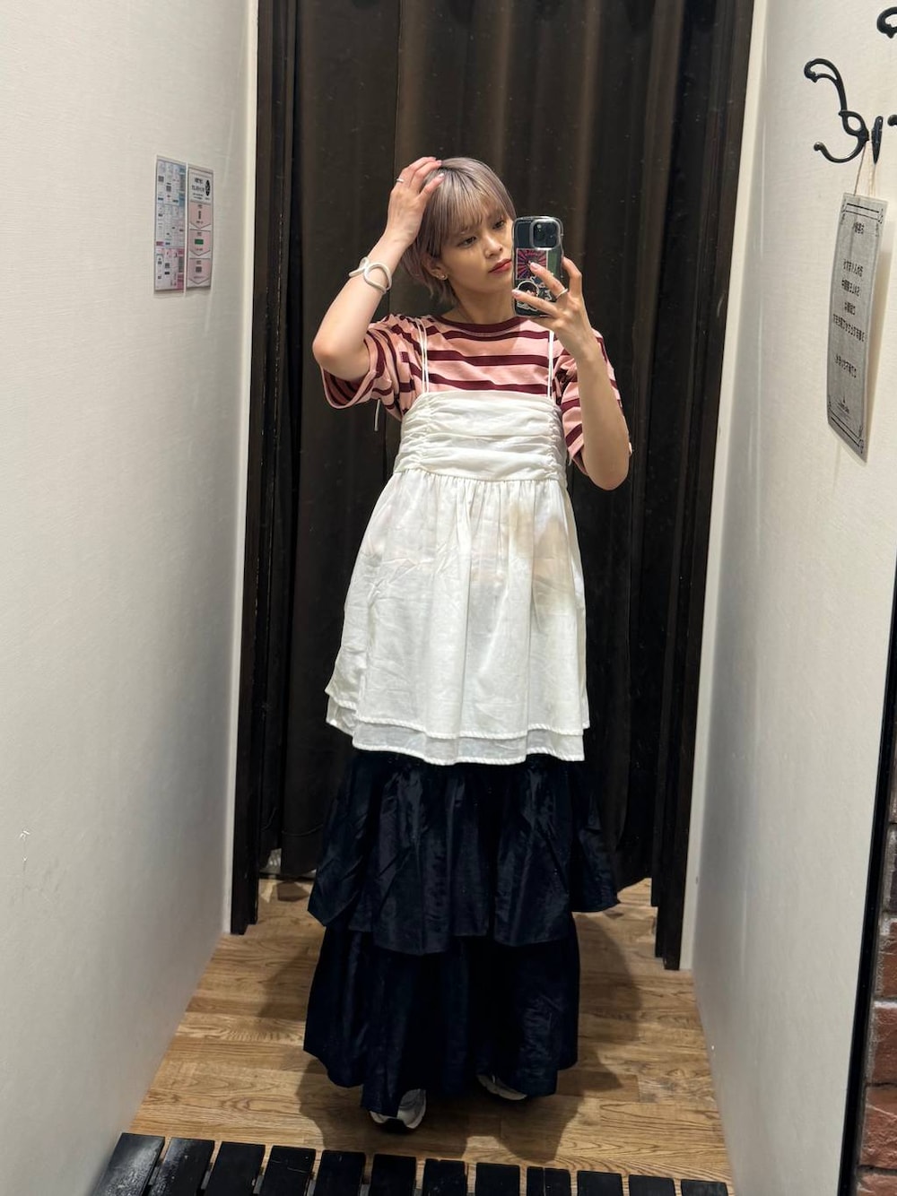 スカートと流行りのチュールトップス合わせが可愛いよねえ、、 ボーダーのTシャツは何枚会ってもいいし こうしてモノトーンコーデに差し込むだけで カジュアル→可愛い印象に♡