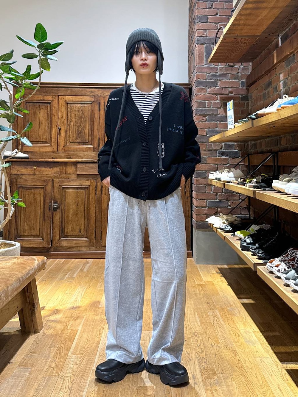 刺繍のデザインや色味が可愛いニットカーディガン お店でもめちゃめちゃ人気です!✨ そこまでダボダボしてないから小柄な方でも着やすいと思うし、高身長でもスッキリ着れるのでむしろかっこよく着こなしていただけます! インスタでも『これいつ販売ですか!』の声が多かったベロアパンツ 超履きやすいのよこれが。 ベロアだからスウェットの部屋着感は軽減されてオシャレ見えするからおすすめ♡
