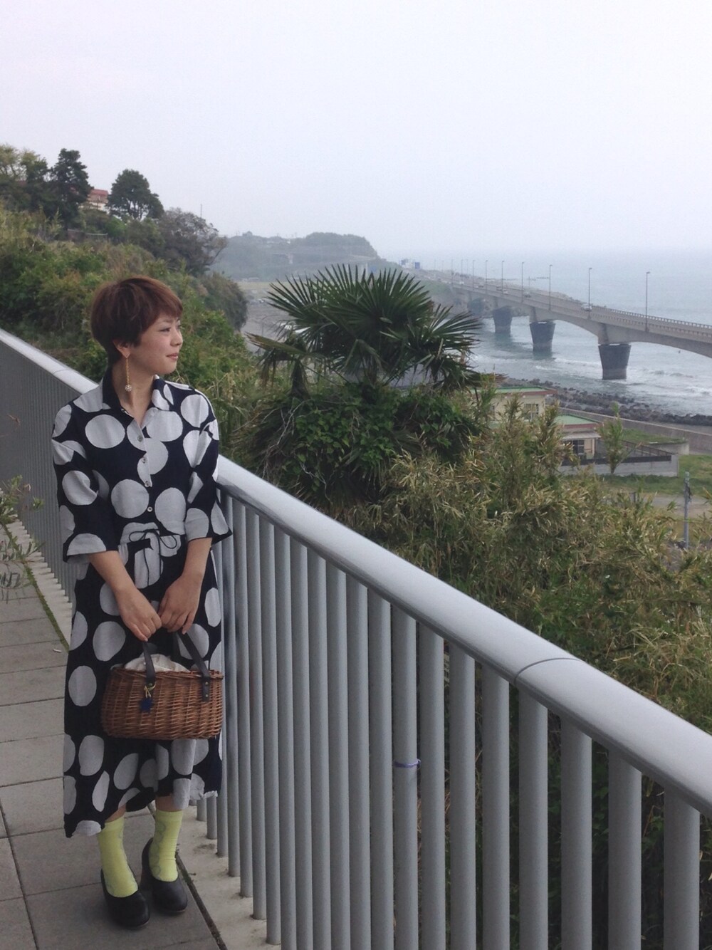 今日は海の見えるカフェへ。 爽やかにネイビーとホワイトの大きなドットのワンピースをサラリと。 イエローのソックスをアクセントカラーとしてプラス。