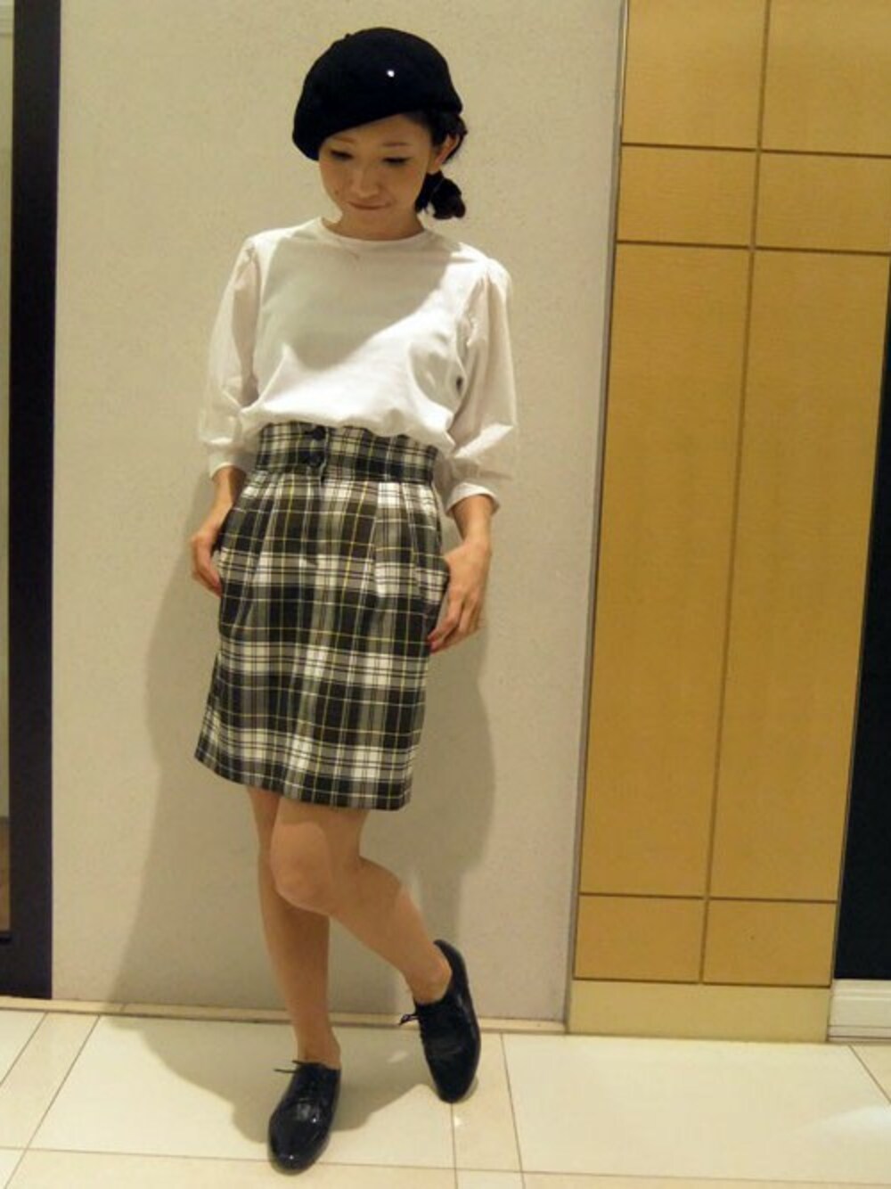 ハイウエストでタイトなシルエットに相性がいいのは、ボリュームのあるトップス。 こちらはサスペンダー付きのスカートのサスペンダーを外して大人っぽくしています。
