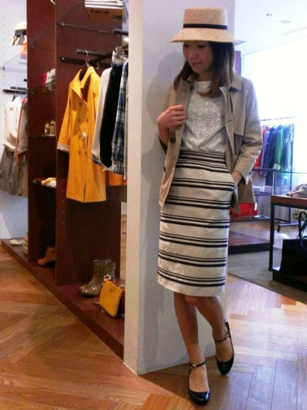 少しAラインのショート丈のトレンチは、撥水、花粉防止と機能も満載。 大人っぽく長めのタイトスカートとの合わせが新鮮です。 インナーに着ているフラワー刺繍のブラウスがとても上品!