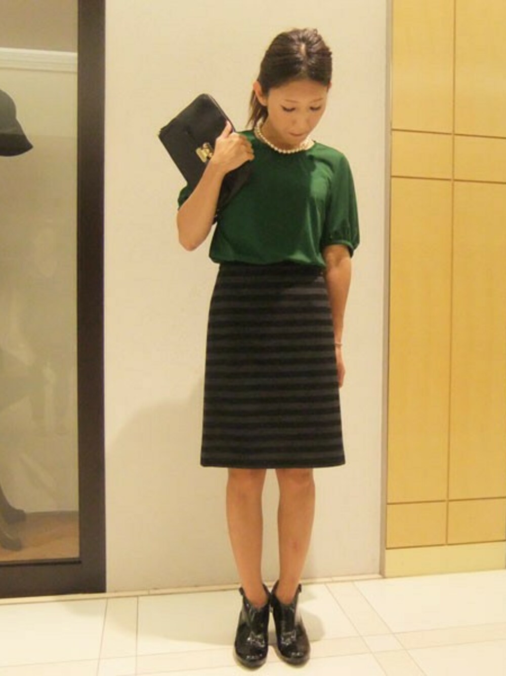 グリーン×グレーの深みのあるカラーが新鮮で秋らしいコーディネート。 袖にボリュームがあるカットソーに対して、スティックラインのスカートの バランスがGOOD!
