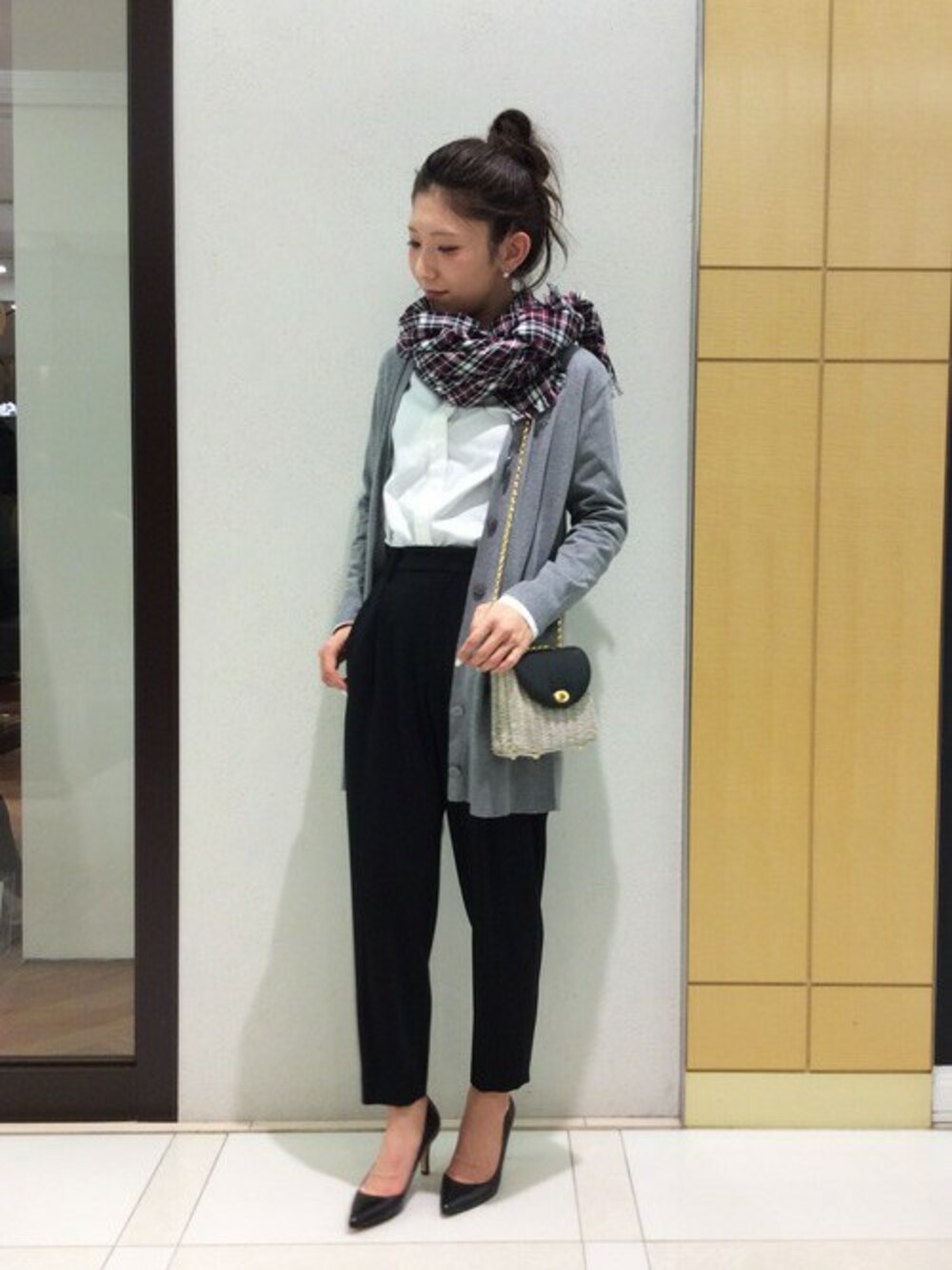 落ち感のあるパンツが今年らしいモノトーンコーディネート。半端丈のパンツには絶妙な着丈のニットカーディガンを合わせて。首元のチェックストールでトラッド感をプラスしています。
