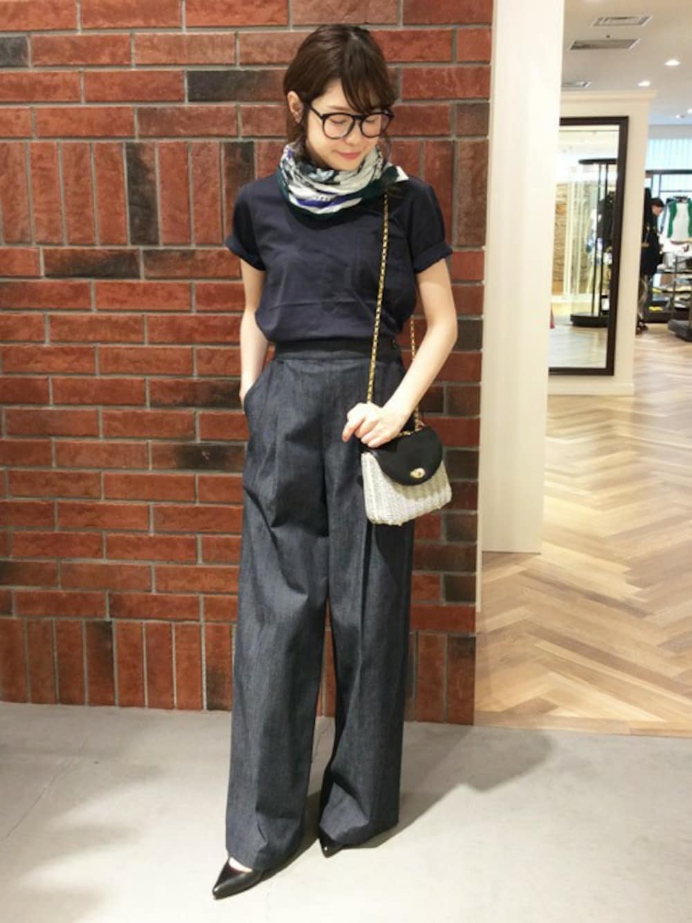 シンプルなポケットTシャツをトレンドのワイドパンツに合わせて。裾巾をたっぷりととったワイドパンツが大人っぽい雰囲気を演出します。シックな色合いにチェーンバッグが効いています。