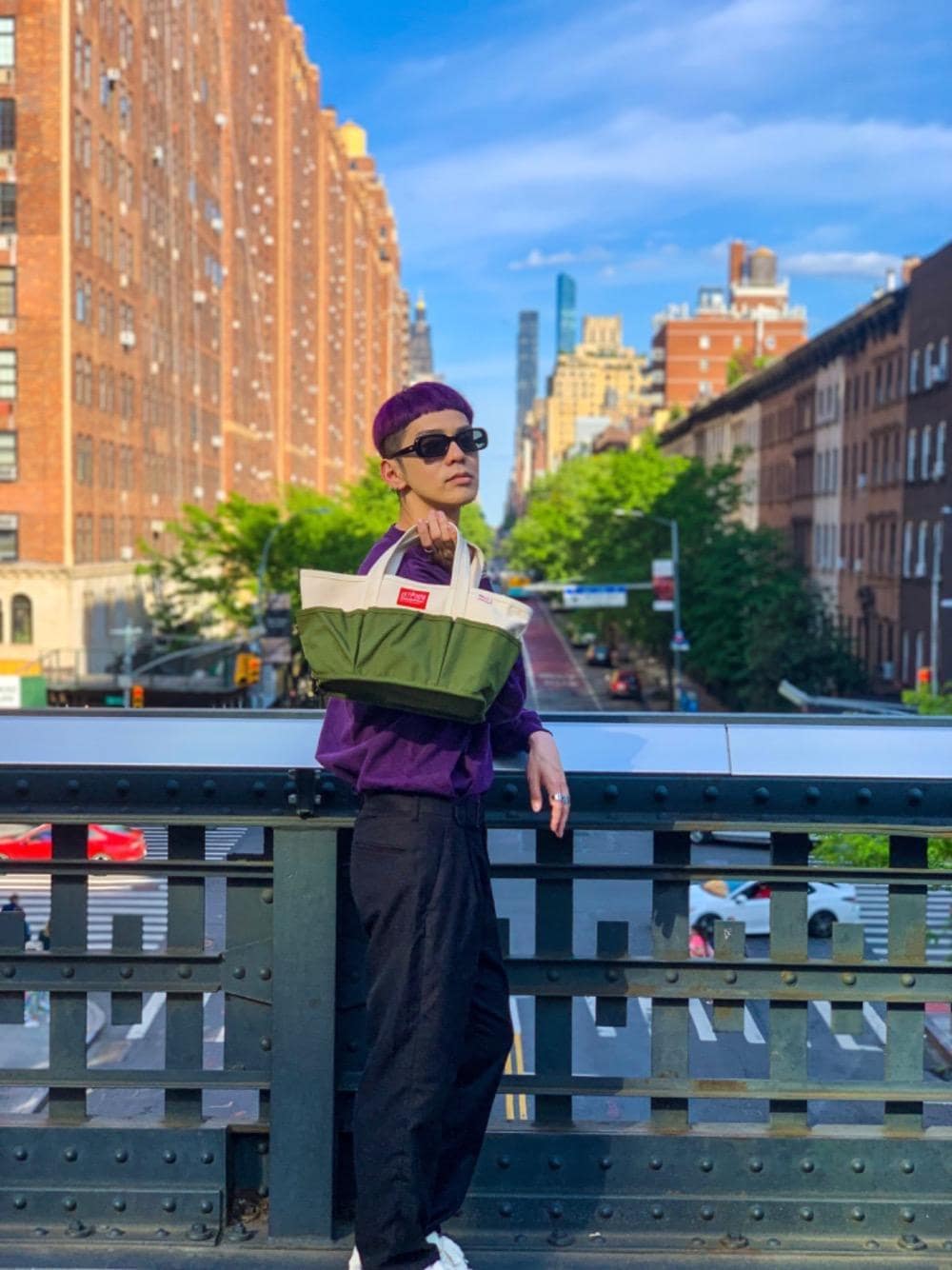 NYのハイラインでの1枚 廃止されたウエストサイド線を利用した空中公園。 公園から見るビル街は、異空間の感覚になりました。 そんなロケーションに、このトートバッグが合うと思い選んで見ました。 ビルとオリーブのカラーがマッチしてオールド感もあります。 貴重品はもちろん一眼カメラも収納できます。 このバッグとオシャレして最高な撮影スポットで思い出の1枚撮って見て下さい。 僕はタックインしてキレイ目スタイルでコーディネート組んで見ました。