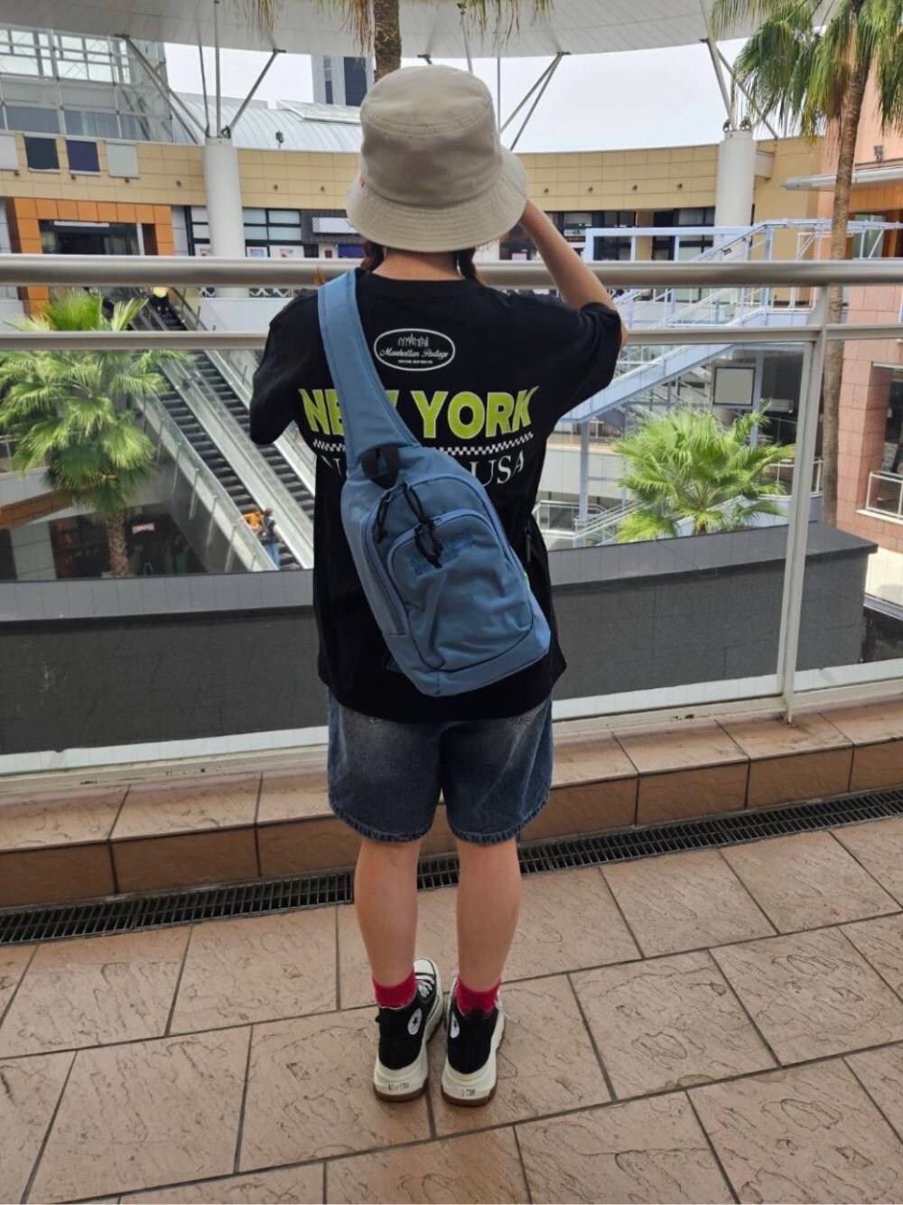 梅雨にぴったりな防水加工のBODYBAG🩵 防水でも、素材が軽く使いやすいです。 ブルーの刺繍とイエロータグの相性バッチリ👍 Tシャツのイエローと合わせても使えます! 暑い日には帽子も必須です🫡