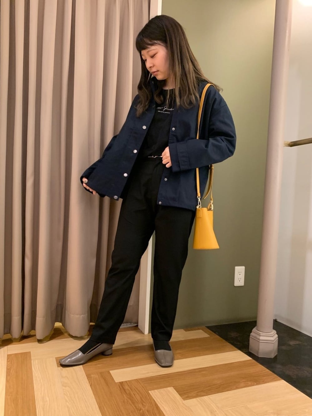 ◎ブラックコーデ ◎襟異素材ブルゾン カーキver. 髪結えば良かった… 襟カッコいいんですよ…