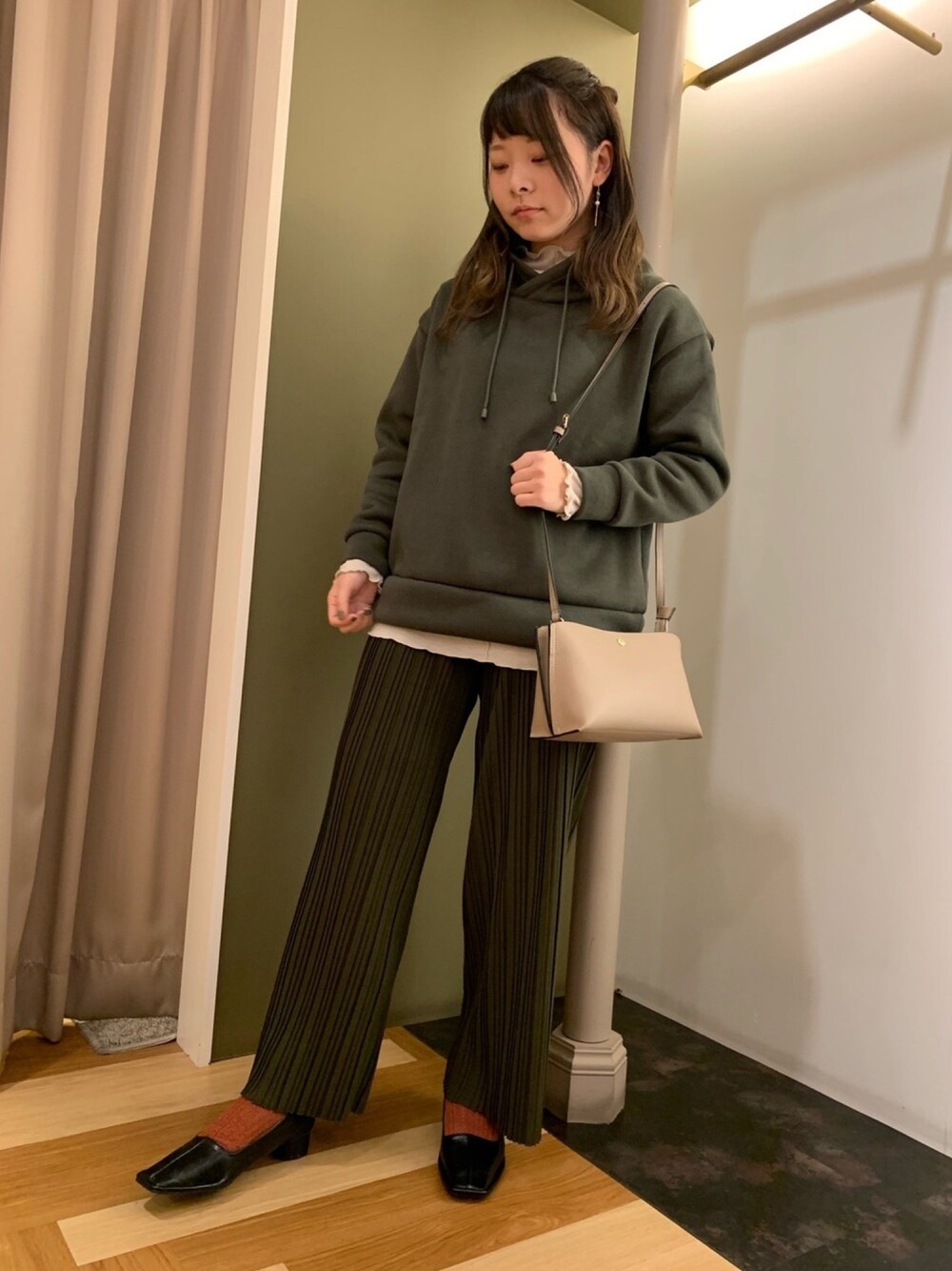 ◎メローハイネックカットインナー ◎立ち襟カットプルオーバー ◎プリーツパンツ インナーを出して カーキを引き立たせています♩ パーカーみたいなのに違う! 立ち襟でカジュアルすぎないです。