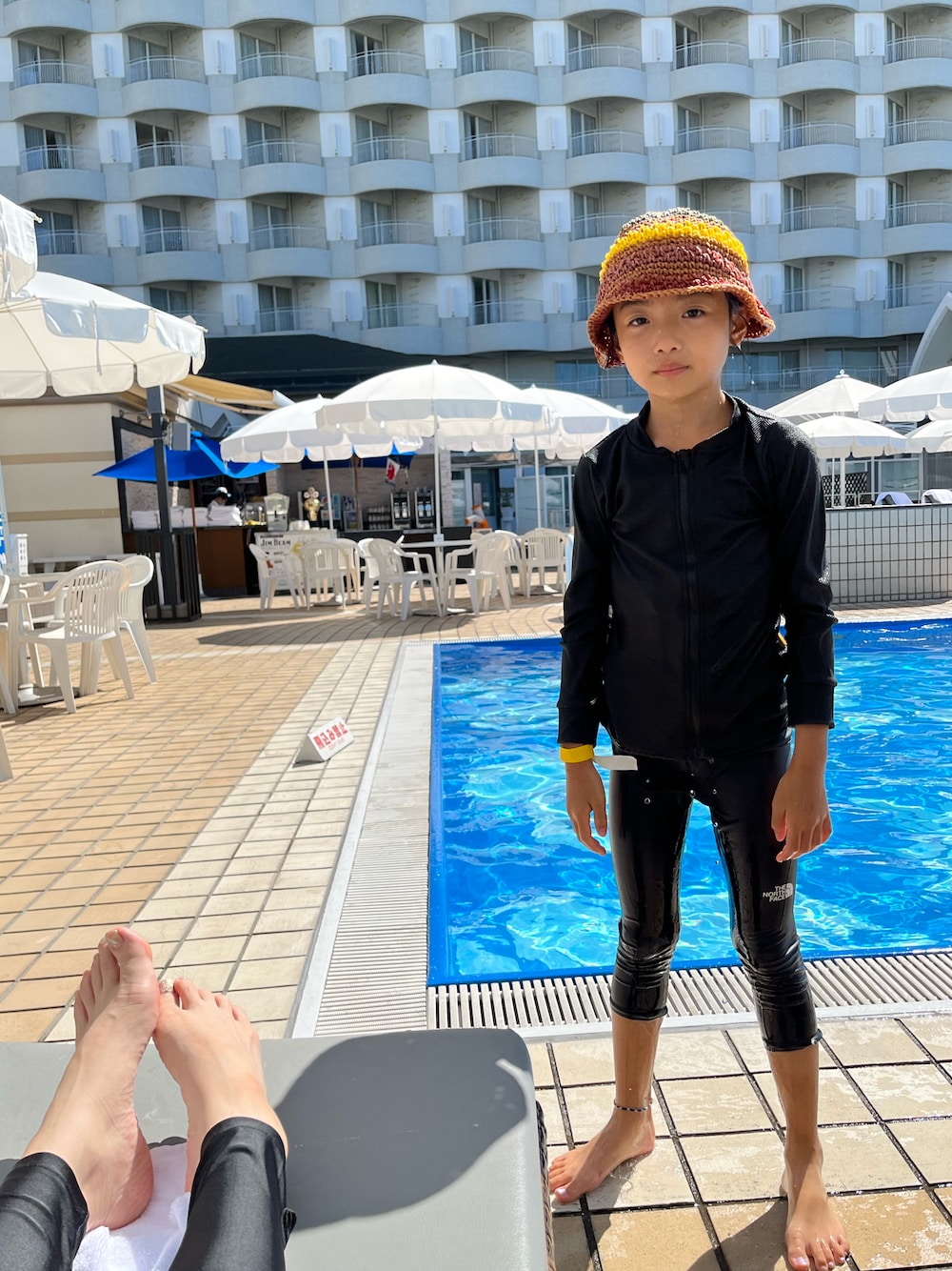 いつもみていただいてありがとうございます✨ プール2日目今日は朝の9時から2時間たっぷりお外のプールです。 お腹が減ったのでお昼前にプールサイドでオニオンリング大好物です。