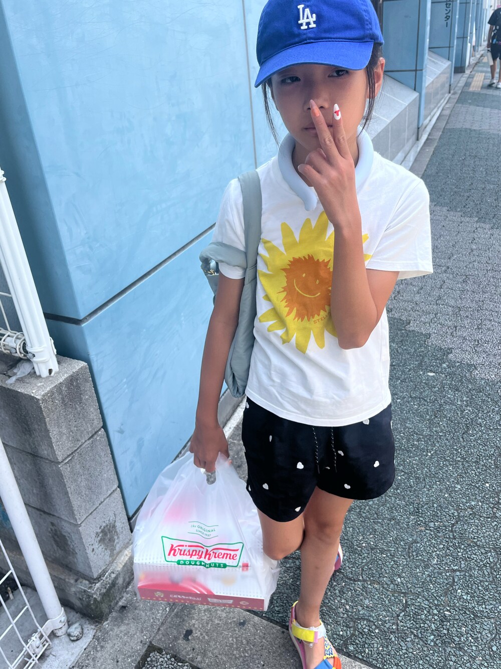いつもみていただいてありがとうございます✨今日は朝から母の用事にお盆のお供え買いに 付き合ってもらって、ちゃっかり行きたい店雑貨屋さんに連れて行かれるパターンですわ。 でも昼からお友達のお家お泊まりなのでドーナツ買って慌ててかえりました。 慌てて行ったのでいっぱい忘れ物したらしくプール帰りに荷物とりに🤪来ました。 楽しい夏休みの過ごし方🌻