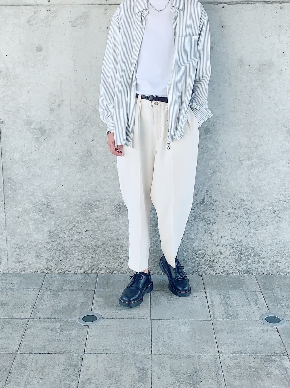 LIDNMのビスコースのシャツに白のパンツを合わせました。