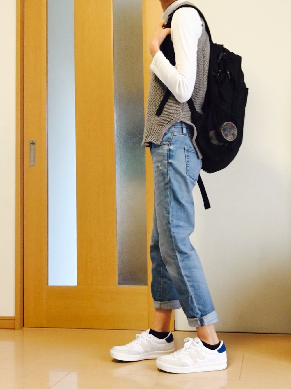 ベストニットのシャツ以外の組み合わせ 雑誌で発見して真似っこ。 ニットベスト × タートルネック \( ¨̮ )/ ✡ リュックから見える丸いやつは ワックスです(笑)存在感(笑)