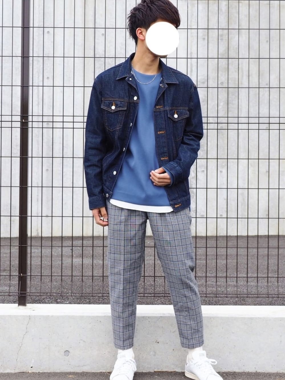 デニムジャケットコーデ🙆♂️ インナーも青をで合わせて爽やかな印象に、パンツはグレーにしてまとめました🌸 何かありましたらお気軽にご連絡ください。 ⭐︎instagram→riyou7192 《サイズ》 ジャケット L カットソー M パンツ M 靴 27