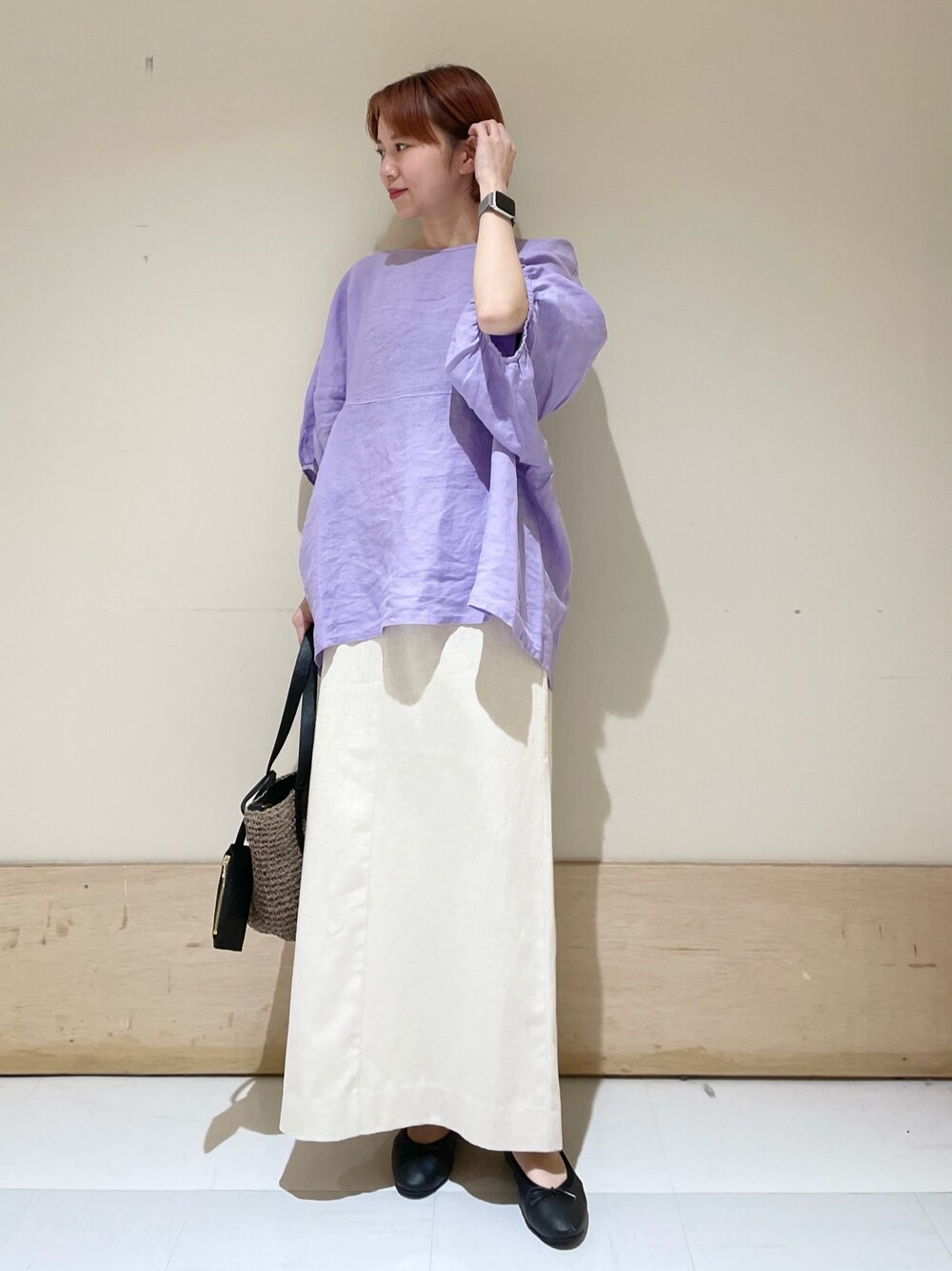 シルエットが可愛いリネンブラウス☺︎ 袖がふわっとしたバルーンスリーブで 二の腕と肘周りをしっかりカバーしてくれます◯ リネンのハリ感がそこまでなく柔らかくて軽いので タックインをしてもお腹周りもたつきません! 落ち感もあるので膨らみ気にならないですよ^ ^ スカートはリネン混の風合いが可愛いです☺️ セミタイトできれいめにもカジュアルにも合わせやすいシルエットなのでテイスト問わずにたくさん着回しできます! instagram @mayuhonda_