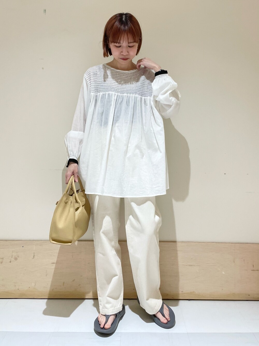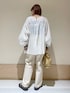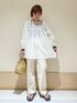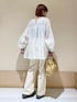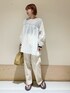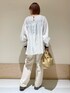 胸元のシャーリングが可愛いブラウス☺︎ シャーリング部分は伸縮性があるので着脱しやすく楽ちんです◯ 生地感とても軽くサラッと着れます^ ^ モノトーンなのでボトムも選ばず合わせやすいです😌 instagram @mayuhonda_