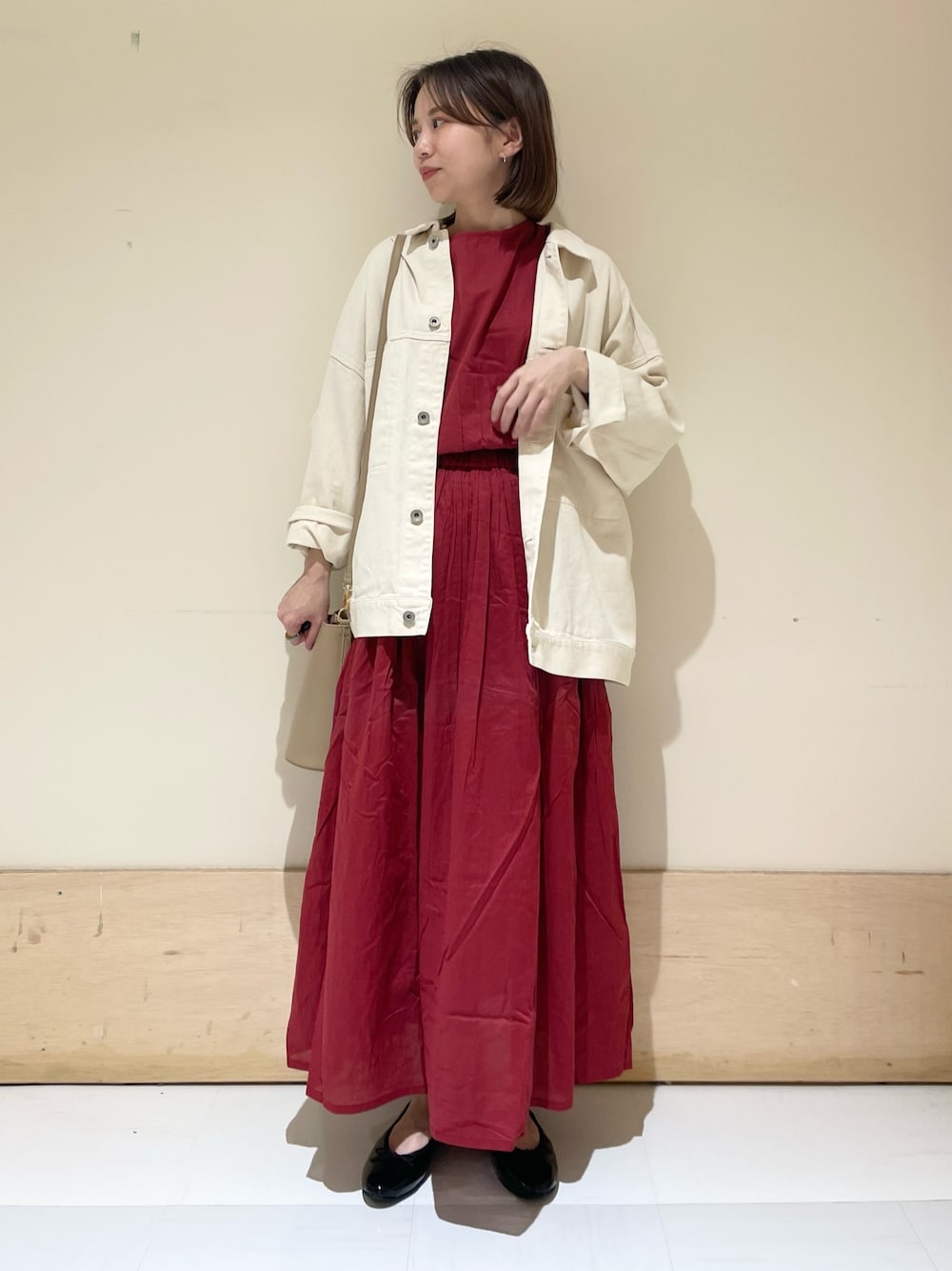 身長:152cm 体型:ウェーブ パーソナルカラー:サマー [サイズ感] ジャケット:ゆとりあり ワンピース:標準的(ウエストギャザーで調整可) シューズ:標準的 [素材感,着心地] ジャケット:秋や春はもちろん、腕周りもドルマンスリーブなので肉厚なスウェットやニットも着れます。真冬手前まで重宝するアイテムです。 ワンピース:総丈は長めですがウエスト位置でギャザーが止まるので小柄な方でも長すぎる事なく調整できます。 シューズ:定番のアイテムで私の足にちょうどよく、毎回買い足してるお気に入りのバレエです。 [ポイント] 気温の寒暖差が大きい時期におすすめのスタイリングです。ジャケットは肩掛けも可愛いです。 instagram @mayuhonda_