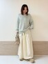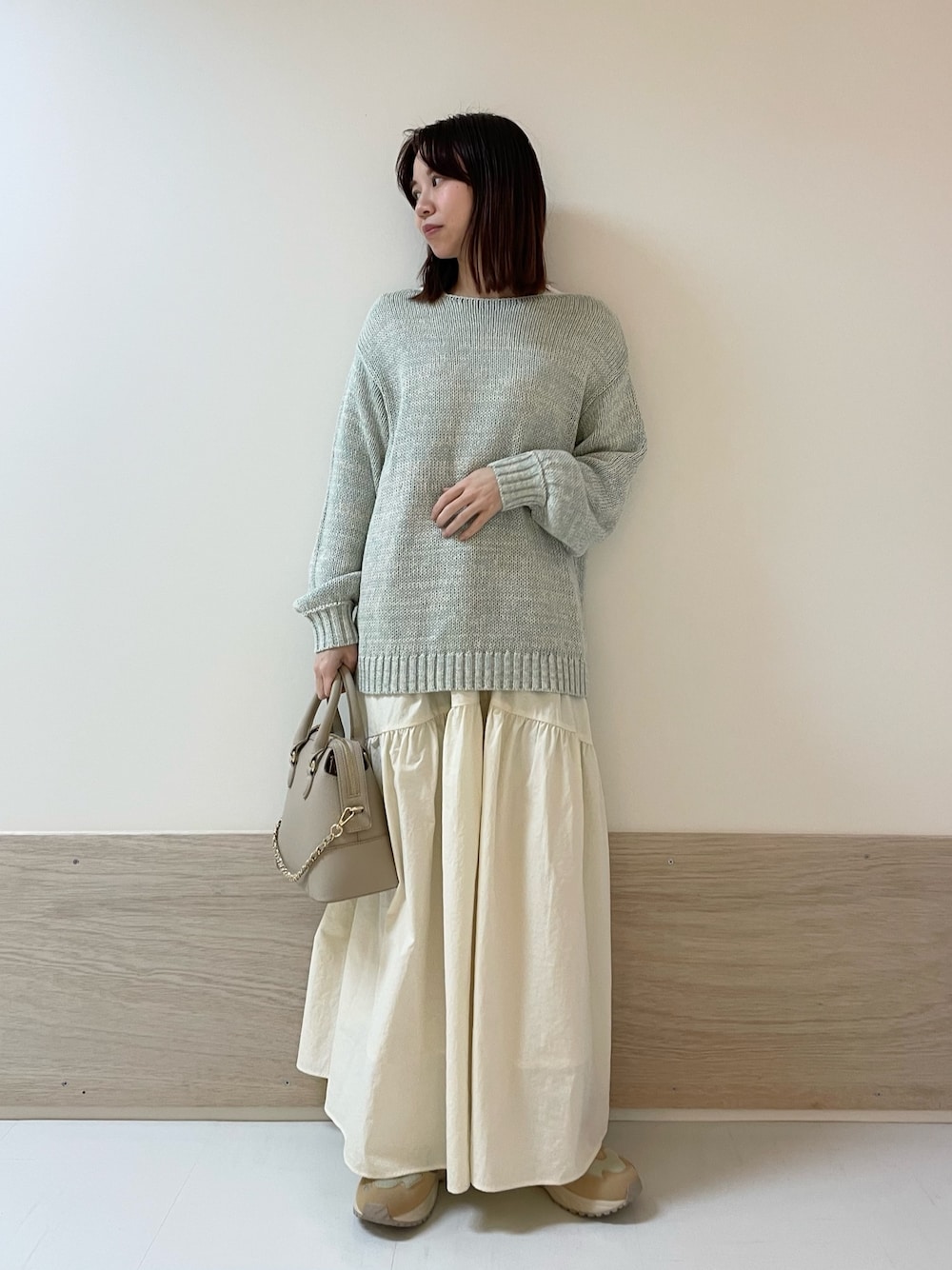 身長:152cm 体型:ストレート パーソナルカラー:サマー [サイズ感] トップス:ややゆとりあり スカート:標準的 [素材感,着心地] トップス:MIX感のある生地が可愛いローゲージニット。麻混のシャリのある風合いでしっかり季節感も出せるアイテムです。爽やかなカラーで見た目から明るくなります。 スカート:ティアードの切替が入ったロングスカートで、程よいハリのある素材感です。広がり方がきれいで、シューズのテイスト問わず着回しできます。 [ポイント] 柔らかいブルーのニットと甘めの白スカートで女性らしい春コーデを意識しました。 instagram @mayuhonda_
