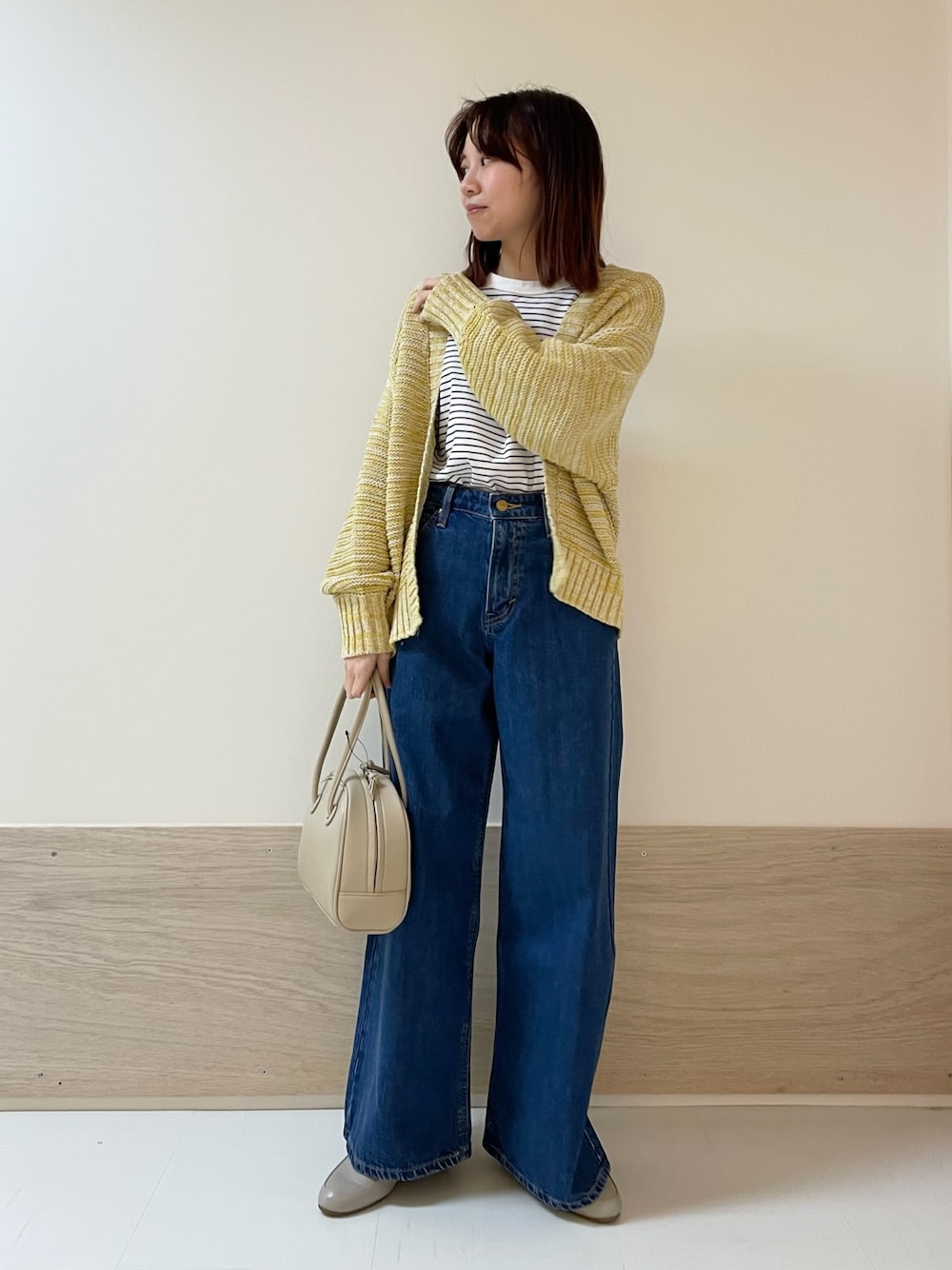 身長:152cm 体型:ストレート パーソナルカラー:サマー [サイズ感] トップス:標準的 カーデ:ややゆとりあり パンツ:標準的 [素材感,着心地] トップス:ベーシックなボーダーtee。柔らかく薄手なのでインナーに使いやすいトップスです。 カーデ:ミックス感のある風合いが可愛いカーディガンです。程よいルーズ感があり、ゆるっとしたシルエットが可愛いです。麻混の素材なので気温が上がってからも使えます。 パンツ:裾がきれいに広がるワイドデニムで、カジュアルすぎず合わせやすいシルエットです。ウエストやおしり周りスッキリしてるのでスタイルアップ効果もあります。 [ポイント] イエローカラーとデニム合わせが春らしくておすすめです! instagram @mayuhonda_