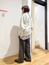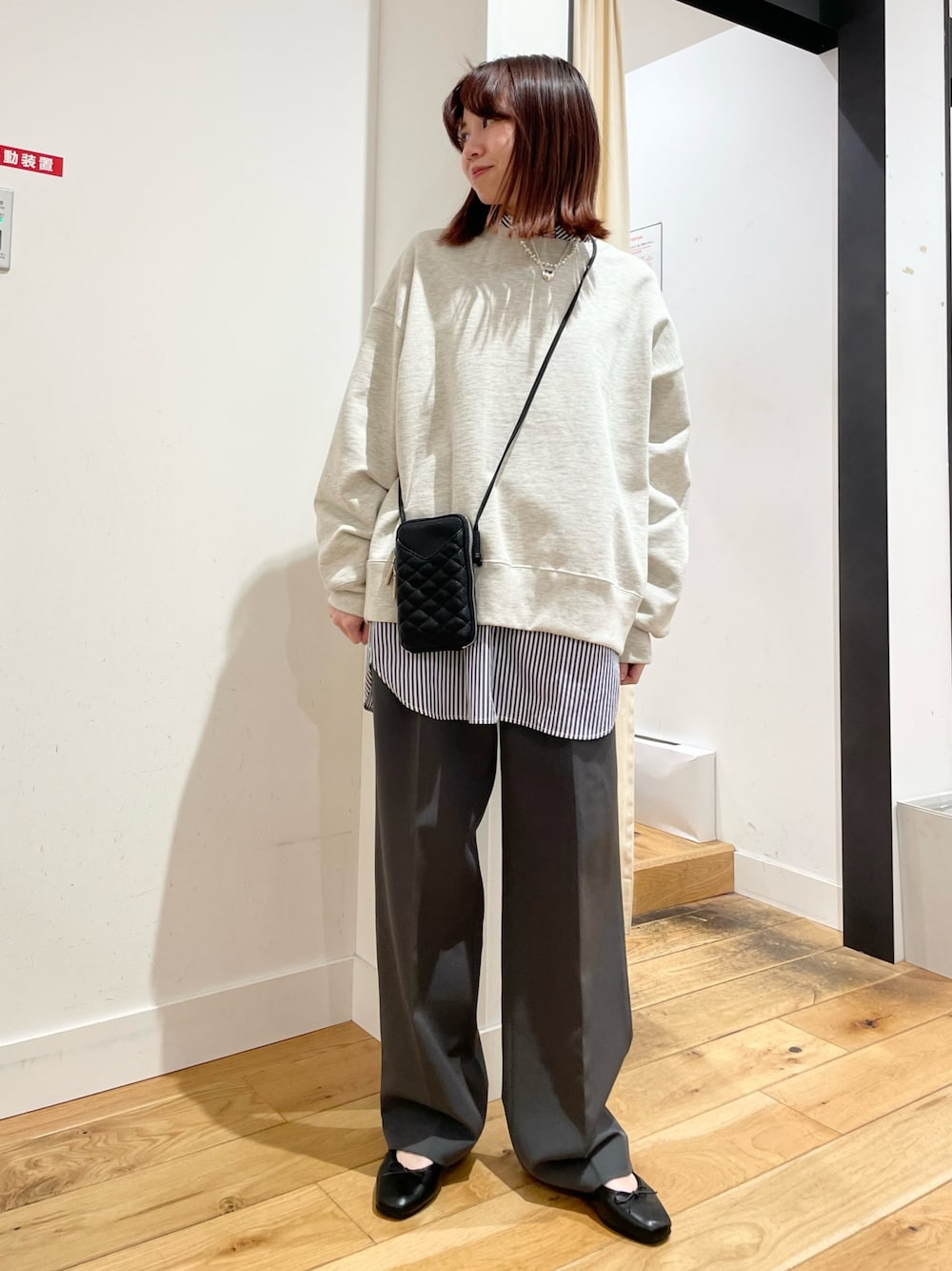 身長:152cm 体型:ストレート パーソナルカラー:サマー [サイズ感] トップス:標準的 シャツ:標準的 パンツ:ややゆとりあり [素材感,着心地] トップス:ベーシックな形のスウェットで着回し力抜群のアイテムです。形がきれいでカジュアルすぎず合わせやすいです。身幅のゆとりはしっかりあり、丈がやや短めなのでダボっとせず着ていただけます。 シャツ:程よくハリのある素材感で羽織りでもインナーでも使いやすいシャツです。ネイビーストライプなので色物のアイテムとも馴染みます。 パンツ:とろみのある柔らかい素材感でサラッとしてます。タックが入ったデザインなので広がり方がとてもきれいなシルエットです。 [ポイント] スウェットをカジュアルにならないようにスタイリングしました。モノトーンで合わせることでよりスタイリッシュにもなります。 instagram @mayuhonda_