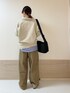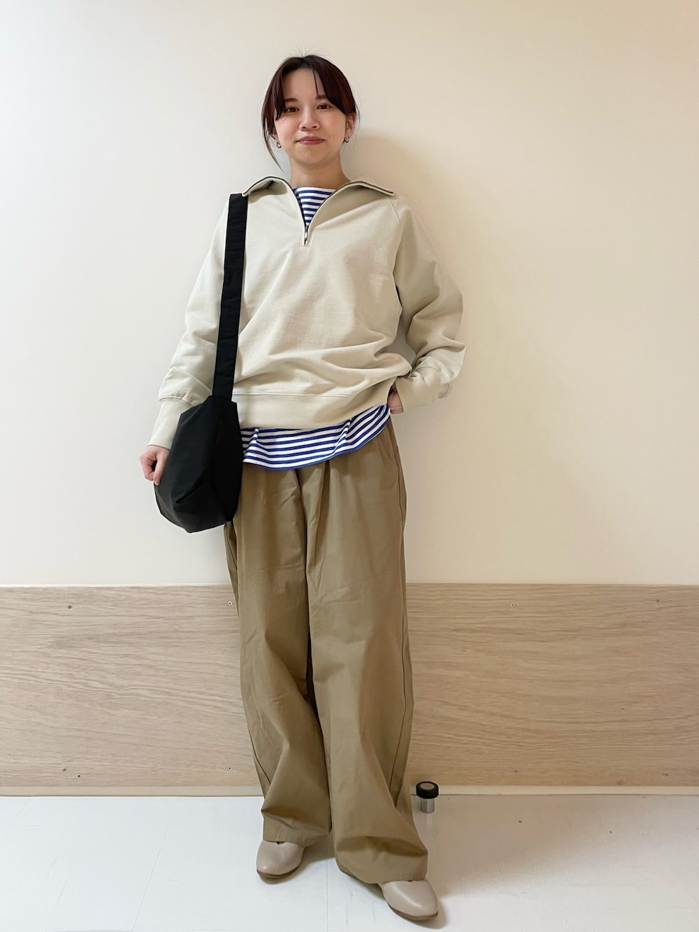 身長:152cm 体型:ストレート パーソナルカラー:サマー [サイズ感] トップス:標準的 インナー:標準的 パンツ:ややゆとりあり [素材感,着心地] トップス:ハーフジップのデザインが可愛いスウェット。ゴワゴワする感じがなくサラッと着やすいです。腕周りもしっかりゆとりがあるのでインナー合わせでも窮屈感出ません。 インナー:裾がラウンドしたロンTで1枚でもインナーでも万能なアイテムです。今回はインナーとして合わせましたが、身体のラインもひろわず生地感薄くないので1枚でもしっかり映えます。 パンツ:ゆったりシルエットが可愛いパンツ。ウエストが後ろゴム&内側に紐が通ってるので体型問わず楽に穿けます。着丈はわたしの身長で少しだけ長いですがバレエでも引きずらないので小柄な方でも安心です。 [ポイント] スウェットとワイドパンツだけだとのっぺりした印象になってしまうので、Tシャツをレイヤードしてメリハリをつけました。 instagram @mayuhonda_