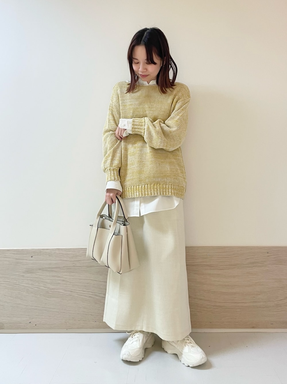 身長:152cm 体型:ストレート パーソナルカラー:サマー [サイズ感] トップス:ややゆとりあり シャツ:標準的 スカート:標準的 [素材感,着心地] トップス:ローゲージでざっとりとした風合いが可愛いニットです。白糸のMIXヤーンなので黄色が強すぎず馴染みやすいです。 シャツ:1枚あるととても便利なアイテムで、色々な着こなしが楽しめるベーシックなシャツです。裾がラウンドしてるのでインナー使いおすすめです。 スカート:サラッとした素材感でロング丈でも重たい印象にならず、シルエットもキレイなのでスッキリ穿けます。サイズはSサイズでちょうどよかったです。 [ポイント] カラーアイテムを合わせて淡色でスタイリングしました。春らしいカラーリングがお気に入りです。 instagram @mayuhonda_