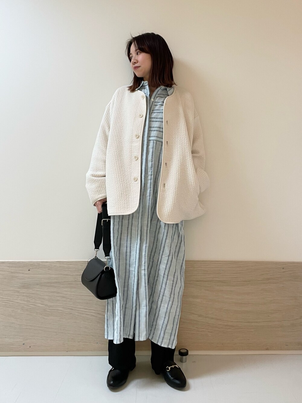 身長:152cm 体型:ストレート パーソナルカラー:サマー [サイズ感] ワンピ:標準的 アウター:ややゆとりあり パンツ:標準的 [素材感,着心地] ワンピ:シャリ感のあるシャツワンピでストライプの配色が可愛いです。着丈はそこまで長すぎず小柄な方でもレイヤードを楽しめます。ベースも同系色なのでブルーが強い印象にならず馴染みやすいです。 アウター:着心地軽くてとても柔らかいキルトジャケットです。首元ノーカラーでスッキリ羽織れます。ご自宅でお洗濯ができるので明るいカラーでも安心です。 パンツ:伸縮性のあるリブニットで動きやすいです。ラインをひろわずスッキリ落ちるシルエットなので体型カバーもしてくれます。 [ポイント] 春のレイヤードスタイルです。ブルーで季節感を出しつつ1枚だとまだ寒いのでパンツをレイヤードさせました。 instagram @mayuhonda_