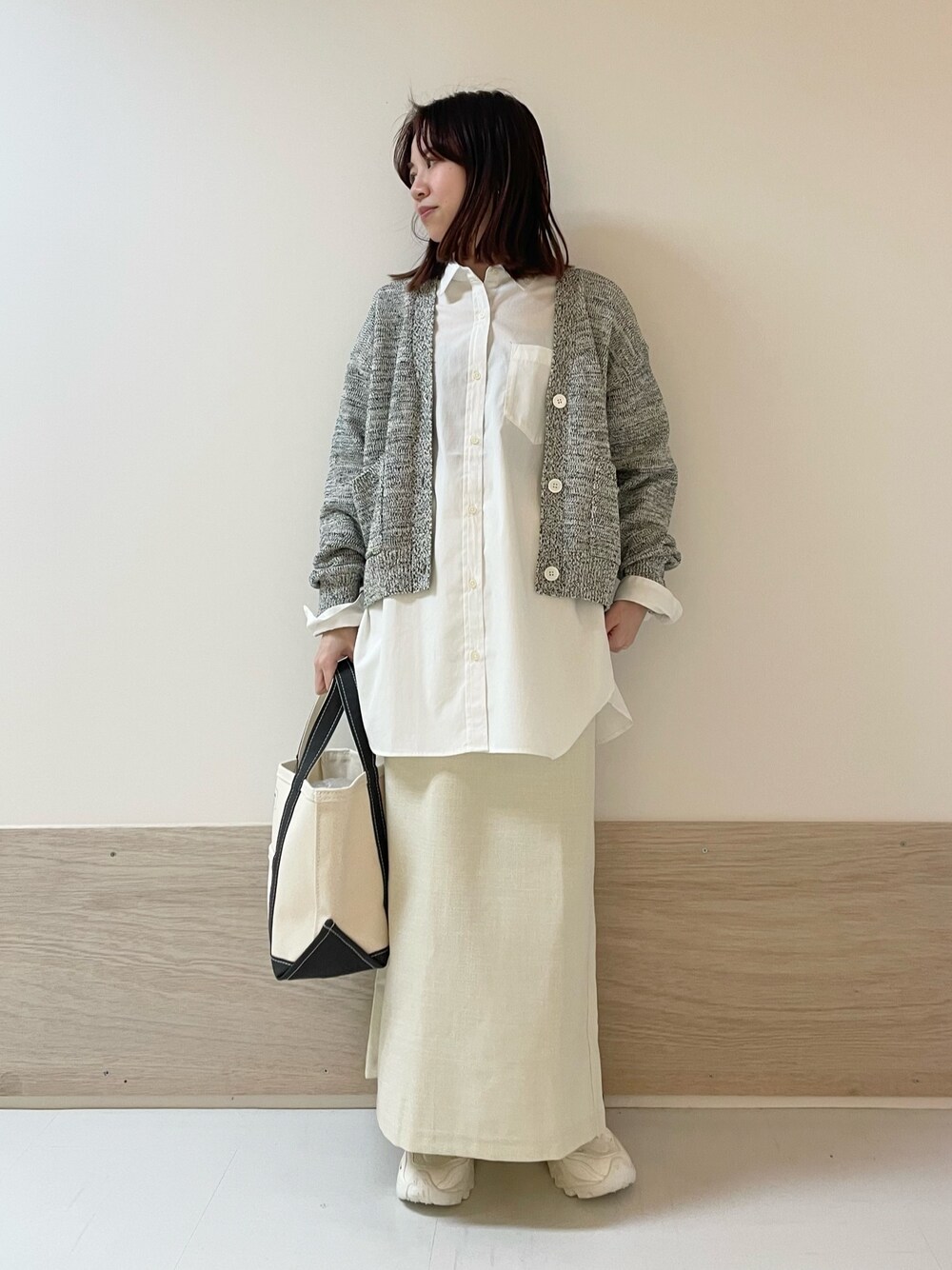 身長:152cm 体型:ストレート パーソナルカラー:サマー [サイズ感] トップス:標準的 カーデ:標準的 スカート:標準的 [素材感,着心地] トップス:ベーシックな形のシャツで、1枚あるととても便利なアイテムです。ニットやスウェットのインナー使いにも、春の羽織りにもおすすめです。 カーデ:ミックスカラーが可愛いカーデで、サッと羽織るだけで雰囲気が出ます。着丈少し短いのでボトムを選ばず合わせやすいです。 スカート:程よくタイトなシルエットで、身体のラインはひろわず綺麗に見えるスカートです。しっかりロング丈ですがスリット入ってるので歩きやすいです。 [ポイント] 白ベースでモノトーンに合わせました。 instagram @mayuhonda_